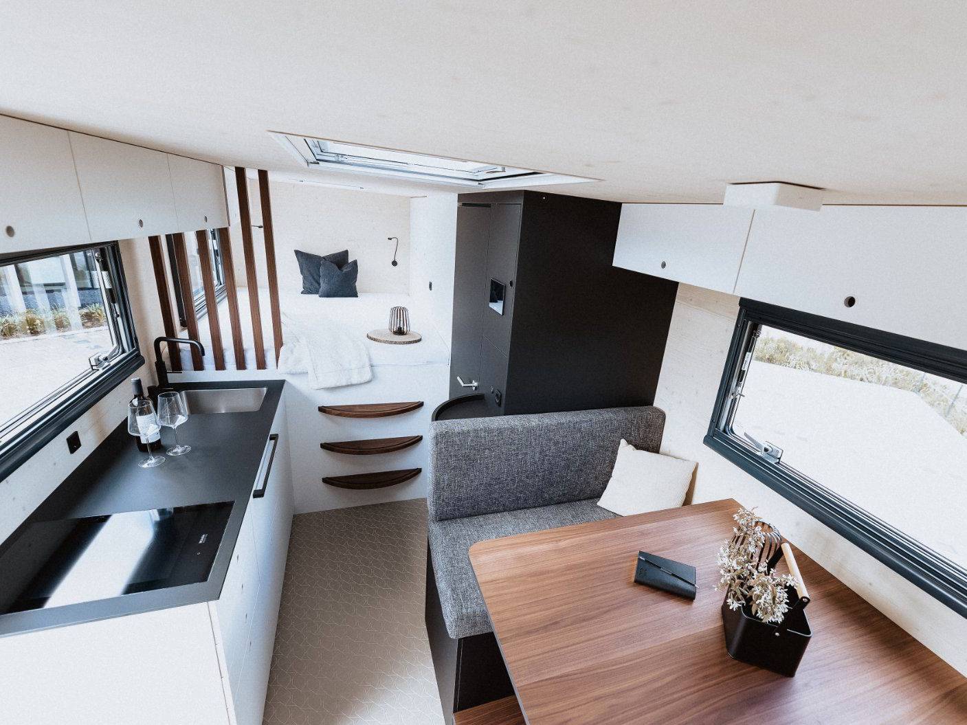 Die Küche im RoadXplorer zeugt von der Expertise der Beer GmbH als Küchenspezialist. Die Soft-Touch-Arbeitsplatte mit dem flächenbündig eingearbeiteten Kochfeld zeigt die hohe Qualität. Elektrogeräte namhafter Hersteller, darunter ein besonders leiser Kühlschrank mit Akustikrückwand und ein Premium-Backofen der Schweizer Marke V-Zug, gehören ebenfalls zum Lieferumfang.