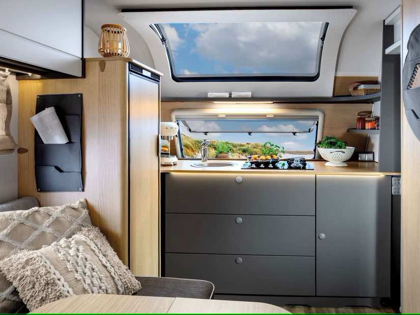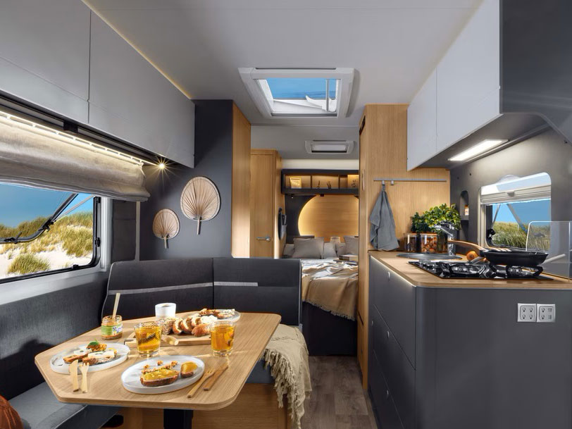 Im Fall des LMC Videro 580 K, der ebenfalls 7,90 Meter lang ist, verrät das „K“ im Namen bereits, dass es sich um einen familienfreundlichen Grundriss handelt (K für Kinder). Er verfügt über Stockbetten im Heck und ein Doppelbett im Bug. Die Mitte des Wohnwagens beherbergt eine geräumige Rundsitzgruppe gegenüber dem Küchenblock. Das Badezimmer befindet sich im vorderen Teil des Wohnwagens neben dem Doppelbett. Der LMC Videro 580 K ist ebenfalls ab einem Preis von 37.500 Euro erhältlich.