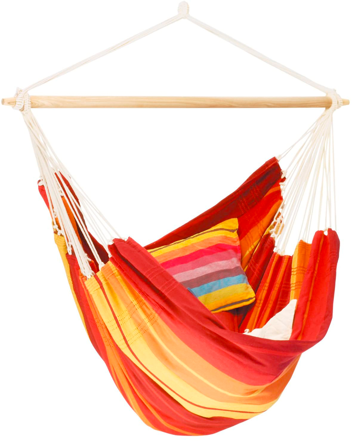 Der wahrscheinlich größte Hängesessel der Welt – bei den Ausmaßen eigentlich schon eher eine Hängematte. Wir verwenden den gleichen festen Stoff wie bei der XXXL-Hängematte Gigante, aufgespreizt mit einem gigantischen 1,40 m Holzstab, dessen patentierte Drechselung (innen dicker als außen) ein Verrutschen der Seile nach innen verhindert. Details * Länge Holzstab: 140 cm Belastbar bis: 150 kg, Farbe: gelb/rot, Gewicht: 3,9 kg, Länge Gesamt: 1,4 m, Material: 85 % Baumwolle (recycelt), 15 % Polyester, Material Gestell: Buchenholzstab, Liegefläche (LxB): 1,4 x 2 m