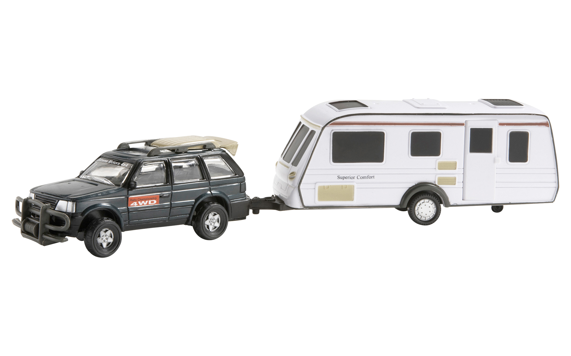 Tür des Autos aufklappbar. Mit Rückzugsautomatik. Maße Auto 13 x 5,5 x 5,5 cm Maße Wohnwagen 18,5 x 4,5 x 5,5 cm Maßstab 1 : 32 Geeignet ab 3 Jahren. Maße (LxBxH): 13 x 5,5 x 5,5 cm, Maßstab: 1:32