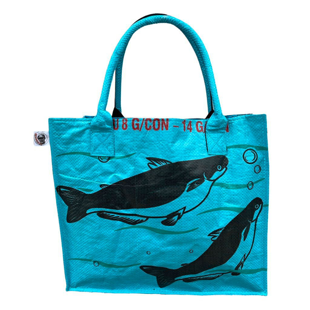 Trendige Shopper aus recyceltem Fischfutter- bzw. Reissack. Eine robuste Tasche nicht nur für den Einkauf, die man einfach wieder zusammenfalten kann. Handmade von Landminenopfern und körperlich behinderten Fachkräften. Produktion zertifiziert durch die World Fair Trade Organisation. Fischfutter bzw. Reissack ist wasserabweisend, reißfest und haltbar. Hochwertige Verarbeitung mit Innenfütterung in Kontrastfarbe. Art Tasche: Umhängetasche, Farbe: hellblau, Gewicht: 0,21 kg, Maße (LxBxH): 35 x 20 x 35 cm, Material: recyceltes Polypropylen ca. 95%