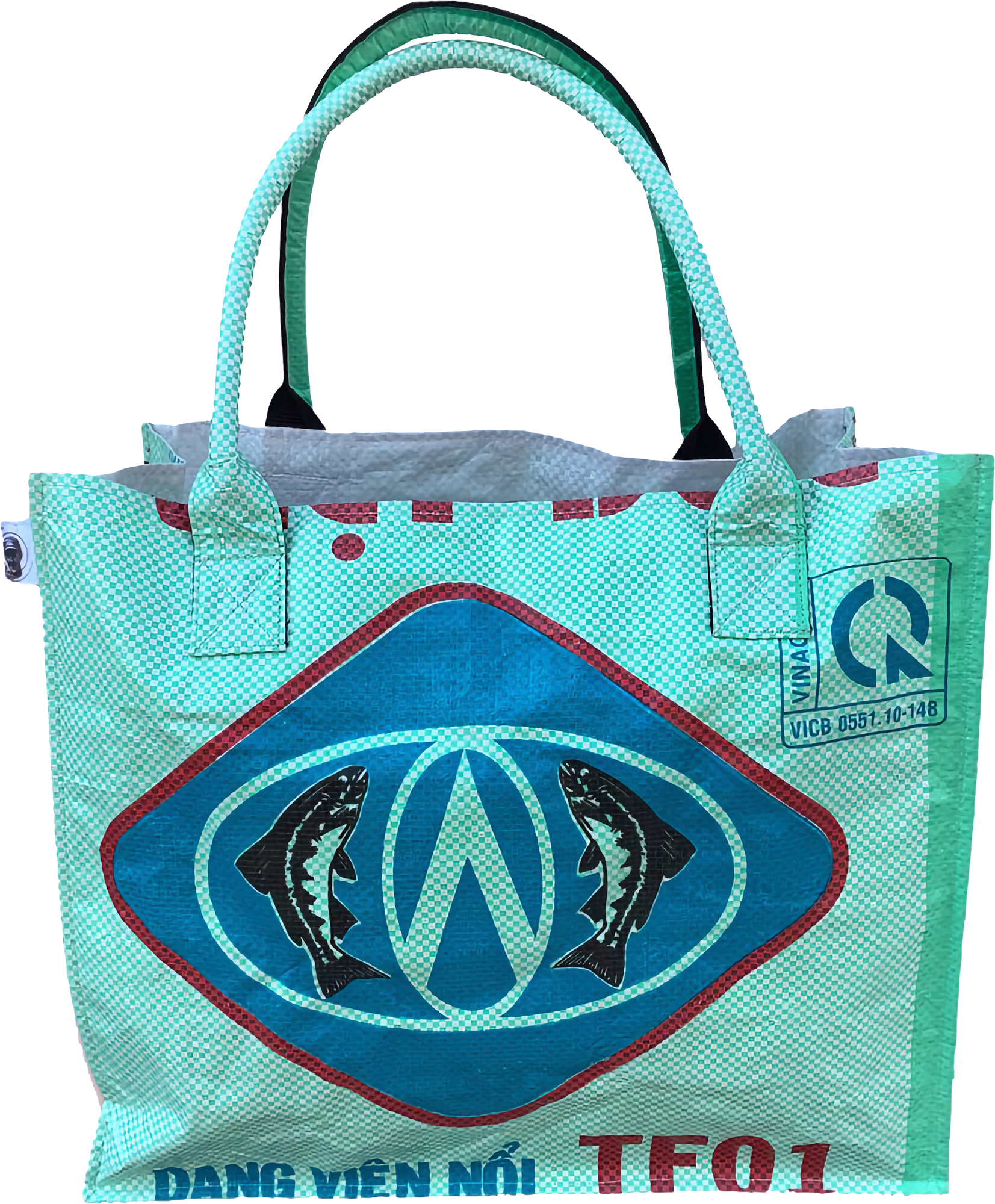 Trendige Shopper aus recyceltem Fischfutter- bzw. Reissack. Eine robuste Tasche nicht nur für den Einkauf, die man einfach wieder zusammenfalten kann. Handmade von Landminenopfern und körperlich behinderten Fachkräften. Produktion zertifiziert durch die World Fair Trade Organisation. Fischfutter bzw. Reissack ist wasserabweisend, reißfest und haltbar. Hochwertige Verarbeitung mit Innenfütterung in Kontrastfarbe. Art Tasche: Umhängetasche, Farbe: mintgrün, Gewicht: 0,21 kg, Maße (LxBxH): 35 x 20 x 35 cm, Material: recyceltes Polypropylen ca. 95%