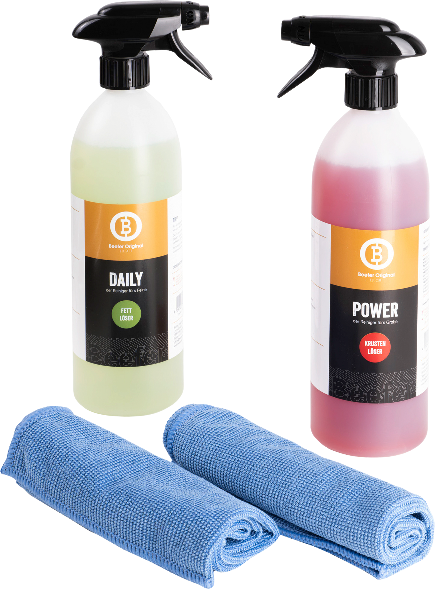 Beefer Reiniger Daily, Power & Set – für eine einfache und effektive Grillreinigung Mit den Beefer Reinigern Daily und Power bringst du deinen Beefer schnell und hygienisch auf Vordermann. Der milde Daily-Reiniger ist ideal für die tägliche Pflege und entfernt frische Verkrustungen, während der kraftvolle Power-Reiniger hartnäckige Rückstände beseitigt. Beide Reiniger kommen in praktischen 750 ml Flaschen mit robustem Sprühkopf. Im Set erhältst du beide Varianten plus zwei Mikrofasertücher – perfekt auch für andere Grills oder die Küche. Details: * Daily: Für die tägliche Reinigung frischer Rückstände * Power: Entfernt hartnäckige Verkrustungen durch hohe Grillhitze * Sprühaufsatz für gezielte Anwendung inklusive * Auch für andere Grills und Küchenoberflächen geeignet * Set enthält beide Reiniger plus Mikrofasertücher Technische Daten: * Inhalt je Flasche: 750 ml * Material Flaschen: Kunststoff * Maße je Flasche: 28 × 7 cm * Hergestellt in Deutschland Lieferumfang: * Variante Daily: 1 Flasche Reiniger Daily (750 ml), 1 Sprühkopf * Variante Power: 1 Flasche Reiniger Power (750 ml), 1 Sprühkopf * Variante Set: 1 Reiniger Daily (750 ml), 1 Reiniger Power (750 ml), 2 Sprühköpfe, 2 Mikrofasertücher Ausführung: Daily & Power