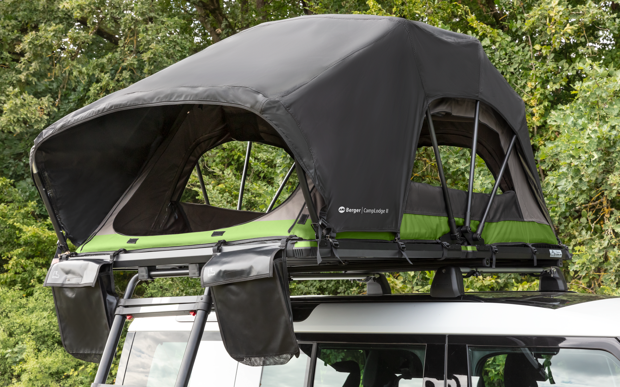 Berger Camp Lodge 120 Dachzelt – für 2 Personen Erlebe die Freiheit des Campings neu – mit unserem exklusiven Dachzelt, das Komfort, Funktionalität und Abenteuerlust vereint. Durch die integrierte LED-Innenbeleuchtung entsteht auch in der Natur eine gemütliche Atmosphäre. Das stabile Aluminiumgestänge und die hochwertigen, wetterfesten Materialien sorgen für Sicherheit und Langlebigkeit, während das praktische Klappsystem ein müheloses Auf- und Abbauen ermöglicht. Mit Platz für bis zu drei Personen und durchdachten Details wie integrierten Schuhtaschen ist dieses Dachzelt der ideale Begleiter für unvergessliche Outdoor-Erlebnisse. Details: * Hohe Belastbarkeit: Tragkraft bis 300 kg – sicherer Halt bei jedem Abenteuer * Kompakte Maße: * geöffnet: 212 × 120 × 95 cm * geschlossen: 127 × 110 × 32 cm * Schnelles Auf- und Zusammenklappen mit integrierter Leiter als Hebel und Stütze Material: * Gestänge, Rahmen: Stabil und leicht aus Aluminiumlegierung * Außenzelt, Innenzelt und Zeltboden: 100 % Polyester, mit Polyurethan-Beschichtung für verbesserte Wetterbeständigkeit * Abdeckung: 100 % Polyester, mit Polyvinylchlorid-Beschichtung für hohe Robustheit und Schutz vor Feuchtigkeit Lieferumfang: * Dachzelt mit integrierter LED-Beleuchtung * 2 Schuhtaschen * Integrierte Leiter (Hebel- und Stützfunktion) Hinweis: Die Querstreben zur Befestigung sind nicht im Lieferumfang enthalten und muss separat bei Thule bestellt werden. Anzahl Personen: 2 Personen Zelt, Art Dachzelt: Klappdachzelt, Blickdicht verschließbar: Ja, Moskitotür: Ja, Nähte bandversiegelt: Ja, Farbe: Schwarz/grün, Gewicht: 50 kg, Höhe innen: 95: 95 cm, Liegefläche (LxB): 212 x 120 cm, Maße (LxBxH): 212 x 125 x 95 cm, Packmaß (LxBxH): 137 x 121 x 37 cm