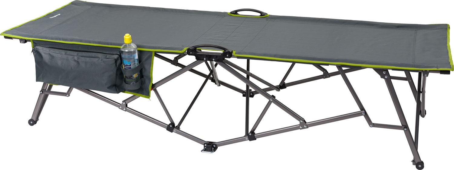 Faltliege Siderno Robuste Faltliege mit praktischem Organizer. Das kleine Packmaß überzeugt beim Transport. Die Liege kann sehr schnell und einfach wieder zusammengefaltet werden. Ideal für das erhöhte Schlafen und schützt somit auch vor krabbelnden Insekten am Boden. Technische Details: * Packmaße (LxBxH): 96 x 21 x 19 cm * Liegefläche (LxB): 200 x 74 cm * Liegehöhe: 46 cm * Rückenlehne (B): 74 cm * Material Bezug: 100 % Polyester * Material Gestell: Stahl, Ø 25 mm * Gewicht: 11,2 kg Lieferumfang: * 1 Liege * 1 Organizer Art Liegen: Liege, Belastbar bis: 150 kg, Farbe: grau, grün, Rückenlehne: nicht verstellbar