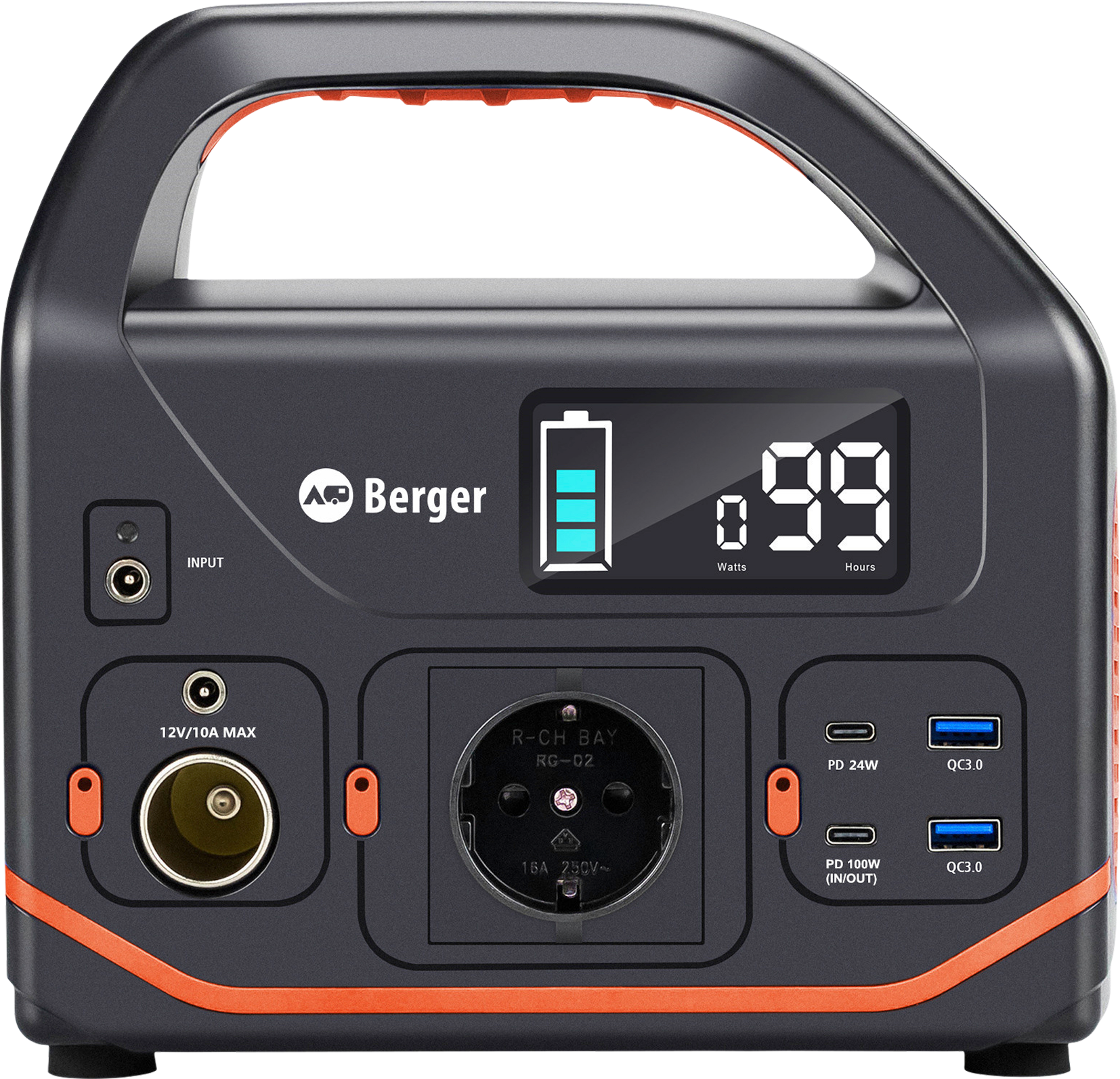 Die Berger Powerstation eignet sich ideal für die Stromversorgung unterwegs Die Berger Powerstationen bieten eine eigene Stromversorgung überall dort, wo du diese benötigst. Die Stationen verfügen über eine Vielzahl an Stromausgängen und lassen sich bequem über 12 oder 230 V aufladen. Die Powerstation BPS 300 verfügt außerdem über eine LED-Leuchte mit 3 Funktionen: Dauerlicht, Blinklicht und SOS-Notsignal. Ideal zum Laden von Laptops, Smartphones oder zum Betrieb anderer Kleingeräte unterwegs BPS300: Kapazität: 333 Wh Dauerleistung: 300 W Spitzenleistung: 600 W Ladezeit: ca. 9 h Stromaufnahme: DC: 12 V (Kfz-Stecker), 230 V Netzteil, USB-C: PD 100 W BPS1000: Kapazität: 999 Wh Dauerleistung: 1000 W Spitzenleistung: 2000 W Ladezeit: ca. 10 h Stromaufnahme: DC: 12 V (Kfz-Stecker), 230V Netzteil, USB-C: PD 100 W, Anderson Port: 25,2~30 V, 300 W max. Stromabgabe: 2x USB, 2x USB-C, 1x 230V Steckdose, 1 x 12V Kfz-Stecker USB QC3.0: 5V/3.1A 9V/2A 12V/1.5A TYPE-C PD 100W: 5V/3A 9V/3A 12V/3A 15V/3A 20V/3A 20V/5A USB-C PD 24W: 5V/3A 9V/2A 12V/2A, DC: 12V/10A Max CIG Port: 12V/10A Max Steckdose: 230V/50Hz Art Batterien und Ladegeräte: Powerstation, Ausführung: BPS 300, Gewicht: 3 kg, Kapazität (Ah): 333 Wh, Maße (LxBxH): 220 x 130 x 200 mm, Leistung (W): 300 W, Leistung: 300 W