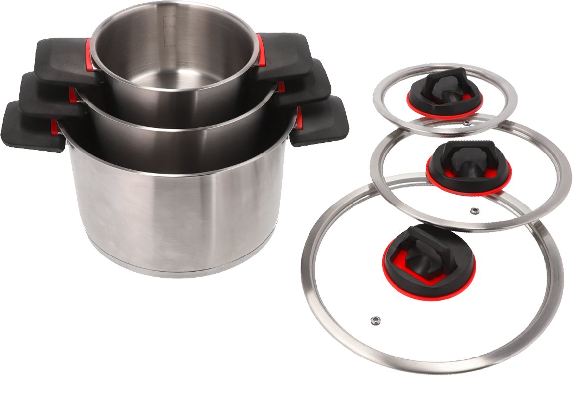 Berger RedSilva Edelstahl Topfset 6-tlg. mit klappbaren Griffen und Glasdeckeln – Kochgeschirr-Sets
