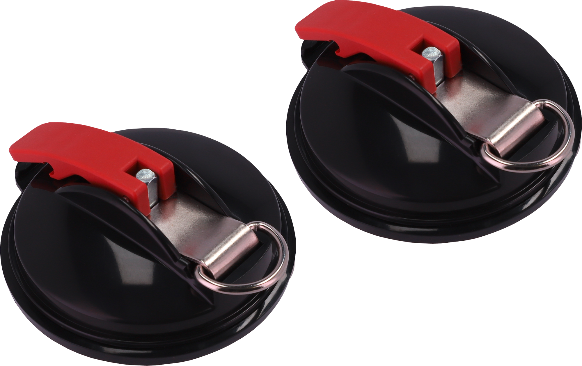 Zuverlässige Vakuum-Saugnapf-Halter (2er-Set) Dieses hochwertige Saugnapf-Set bietet starken Halt auf glatten Oberflächen und eignet sich ideal fürs Camping, für Fahrzeuge, Werkstattarbeiten oder zum Befestigen von Zubehör. Dank robustem Materialmix und komfortabler Verriegelung ist eine sichere Fixierung jederzeit gewährleistet. Details: * Durchmesser Saugnapf: 11,5 cm * Produktmaße: 13 × 11,5 × 5 cm * Belastbarkeit: bis 50 kg Material: * 100% hochwertiger, widerstandsfähiger Kunststoff * 100% rostfreier Edelstahl Lieferumfang: * 2 × Saugnapf-Halter * 4 × Karabiner Farbe: schwarz / rot, Gewicht: 460 g