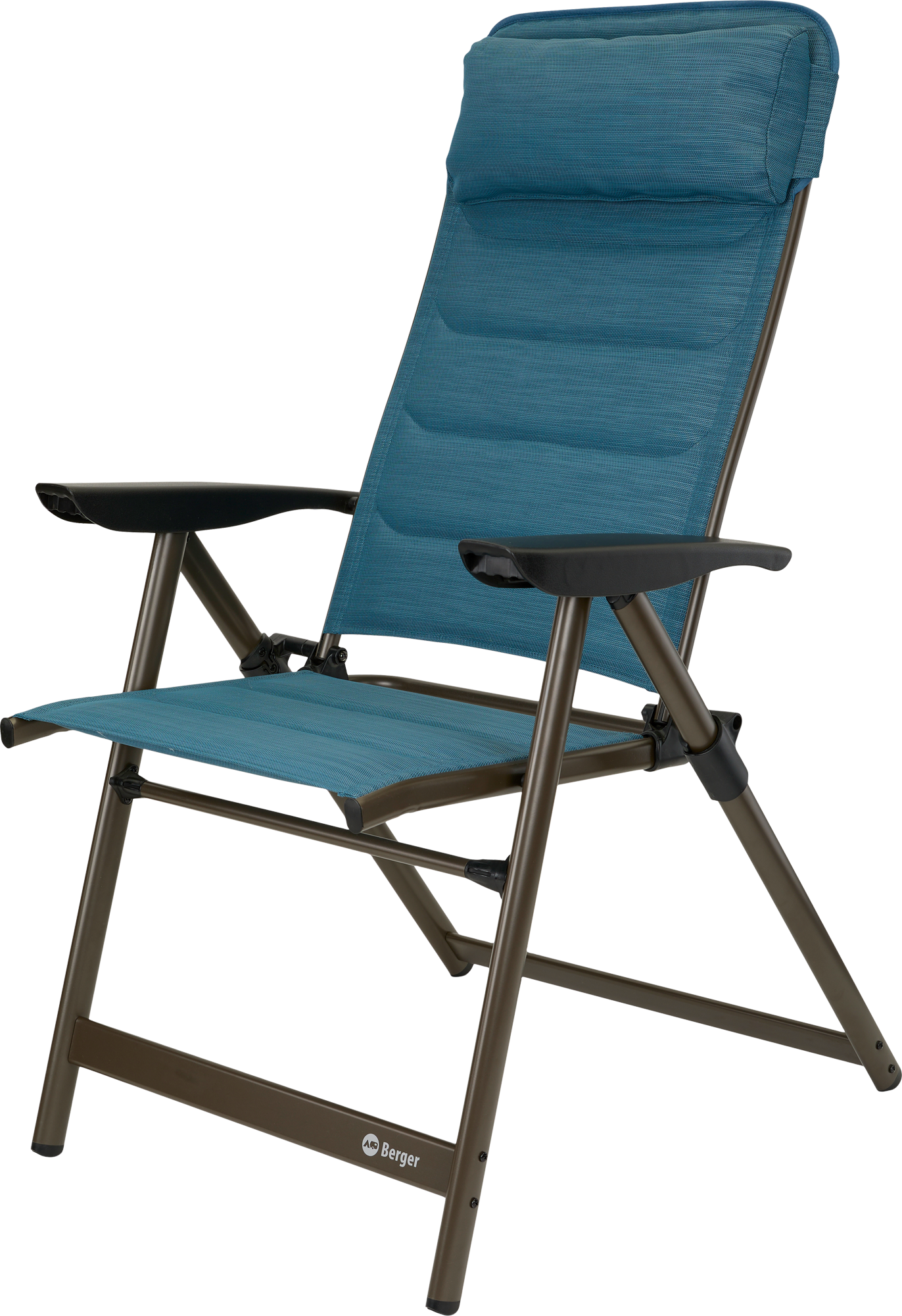 Die perfekte Kombination aus Funktion und Komfort Der Berger Klappsessel Slimline ist ein sehr leichter und komfortabler Campingstuhl. Er überzeugt mit einem hohen Sitzkomfort durch den gepolsterten Bezug, dem abnehmbaren Kopfkissen und der 5-fach verstellbaren Rückenlehne. Das geringe Gewicht und das kleine Packmaß sorgen für einen leichten Transport und machen den Berger Klappstuhl Slimeline zu einem perfekten Begleiter im Campingurlaub. Ein absoluter Hingucker auf jedem Campingplatz sind die verschiedenen Polsterfarben. Technische Daten: * Maße offen (HxBxT): 120 x 64 x 70 cm * Packmaße (LxBxT): 110 x 65 x 10 cm * Sitzhöhe: 50 cm * Sitzfläche (BxT): 48 x 40 cm * Rückenlehne (BxH): 48 x 78 cm * Material Bezug: 70 % Polyvinylchlorid, 30 % Polyester * Material Gestell: Aluminium, 40 x 25 mm * Gewicht: 6 kg Lieferumfang: * 1 x Stuhl * 1 x Kissen Art Sitzmöbel: Klappstuhl, Belastbar bis: 120 kg, Rückenlehne: 5-fach verstellbar, Farbe: Persisch-blau