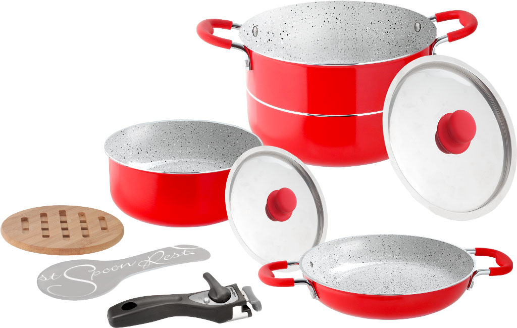 10-teiliges Alu-Kochtopfset mit langlebiger Antihaft-Keramikbeschichtung. Hohe Kratzfestigkeit. Silikonbeschichtete Griffe. Für alle Herdarten geeignet. Set besteht aus: * 1 Pfanne: Ø 22 cm * 1 Topf mit Deckel: Ø 22 cm * 1 Kasserolle mit Deckel: Ø 18 cm Details * Durchmesser Topf mit Deckel: 22 cm * Durchmesser Kasserolle mit Deckel: 18 cm * Durchmesser Pfanne: 22 cm * Füllmenge großer Topf: 5,3 Liter * Füllmenge mittlere Kasserolle: 3 Liter * Füllmenge Pfanne: 1,8 Liter * Antihaftbeschichtung * Perfluoroctansäure-frei Lieferumfang 8+2 teiliges Topfset, 1x Bambus-Untersetzer, 1x Kochlöffelablage, 1x Griff, 1x Spanngurt (100% Polyester), 1x Falt-Transportbox. Farbe: rot/silber, Gewicht: 4,2 kg, Antihaftbeschichtung: Ja, Anzahl abnehmbare Griffe: 1, Anzahl Deckel: 2, Anzahl Kasserollen: 1, Anzahl Pfannen: 1, Anzahl Töpfe: 1, Durchmesser Deckel: 18 + 22 cm, Durchmesser Kasserolle: 18 cm, Durchmesser Pfanne: 22 cm, Durchmesser Topf: 22 cm, Füllmenge Topf: 5,3 L, Teile: 10 tlg, Trage Verschlussgurt: Ja, Material: .