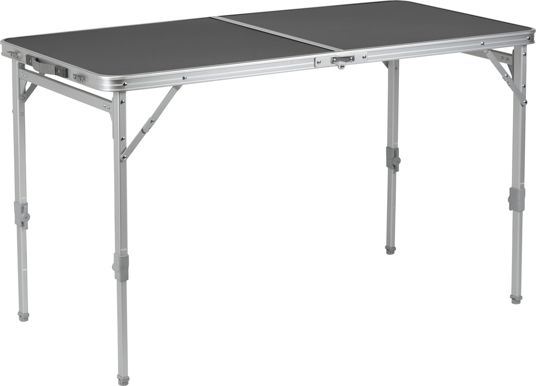 Hochwertiger Outdoor-Tisch mit wetterfester Klapptischplatte und leichtem, höhenverstellbarem Gestell aus eloxiertem Aluminium. Im zusammengeklappten Zustand sehr kompakt verstaubar und somit ideal für Kleinbusse, Vans und Wohnmobile. Details * Höhenverstellung * In der Mitte faltbar * Gestell aus eloxiertem Aluminium * stabile Konstruktion aus Aluminium-Rechteckprofilen * wetterfeste Tischplatte, für den Außenbereich geeignet * zusammengeklappt, leicht und einfach zu transportieren Klapptisch: ja, Höhenverstellbar: Ja, Belastbar bis: 30 kg, Farbe: grau, Gewicht: 6,5 kg, Maße (LxBxH): 120 x 60 x 70 cm, Maße geklappt (LxBxH): 60 x 60 x 8 cm