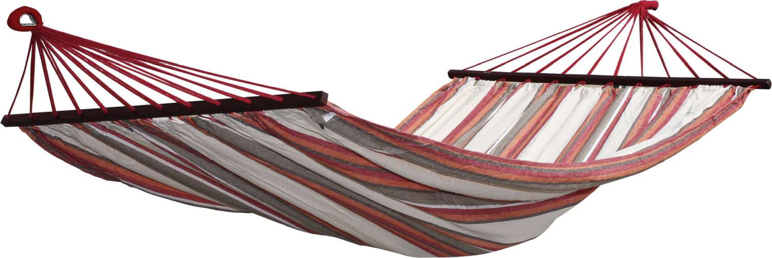 Komfortable Hängematte mit Holz-Spreizstab, der das Zusammenklappen des Mattentuches verhindert. Details * Maße geschlossen: 85 x Ø 10 cm Belastbar bis: 100 kg, Gewicht: 1,6 kg, Länge Gesamt: 290 cm, Material: 100% Polycotton, Farbe: beige/orange/rot, Liegefläche (LxB): 200 x 100 cm