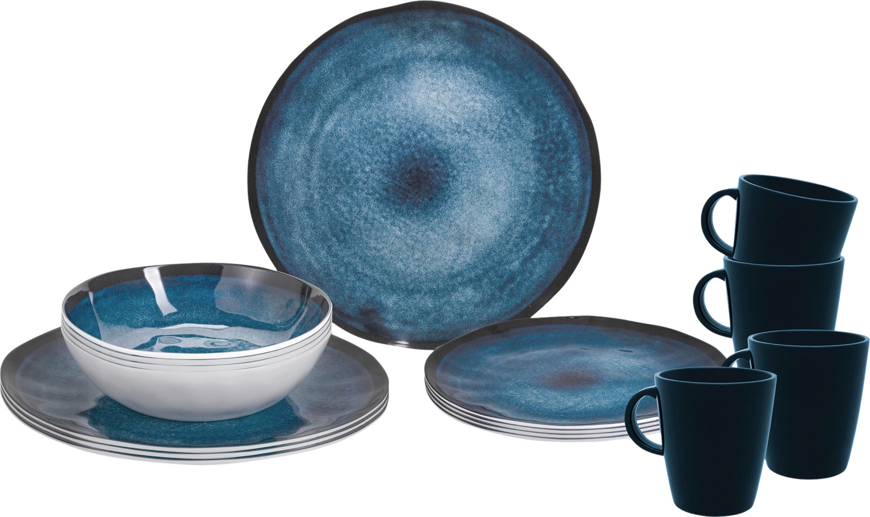 Melamin Melamin ist ein hochwertiger Kunststoff, der sich aufgrund der folgenden Eigenschaften besonders gut den täglichen Outdoor-Einsatz eignet. Antislip Dank der Verwendung einer in den Becherboden integrierten Antirutsch-Dichtung, wird ein Verrutschen und eventuelles Fallen der Tassen deutlich erschwert. Zudem vermindert sich das störende Klappergeräusch während der Fahrt deutlich. Neues Resilyn Resylin ist ein farbloser Thermoplast auf ABS-Basis (Acrylnitrilbutadienstyrol), bei dem sich gute mechanische Eigenschaften mit einer guten Chemikalienbeständigkeit verbinden. Details * Hitze- und feuchtigkeitsbeständig * Verwendung bis 90 °C (kurzzeitig 100 °C) * Geruchs- und geschmacksneutral * Hygiensch, leicht zu reinigen * Ausgezeichnete Isolationseigenschaften * 100 % BPA-frei und lebensmittelecht * Sehr harte Oberfläche * Stoß und schlagfest * Bruchfest (auch in der Kälte) * Beständig gegen Korrosion und Abrasion * Dimensionsstabil * Gefriertruhen geeignet * Spülmaschinenfest * Umweltfreundlich durch Langlebigkeit * Glänzt wie Porzellan (Porzellan Touch) * Recyclebar Maße Set Inhalte (je nach Ausführung) * Maße Essteller: Ø 24,5 cm (spherica) / 25 cm (astralys, serenade) / 26 cm (sequoia /breeze) * Maße Suppenteller: Ø 19 cm (breeze) /20 cm (spherica) / 21 cm (sequoia, serenade) / 22 cm (astralys) * Maße Dessertteller: Ø 20 cm (sequoia, astralys, spherica, serenade) / 23 cm (breeze) * Maße Henkelbecher: 30 cl Lieferumfang: 4 Essteller, 4 Suppenteller, 4 Dessertteller, 4 Henkelbecher Spülmaschinenfest: Ja, Material: Melamin, Ausführung: breeze, Farbe: blau