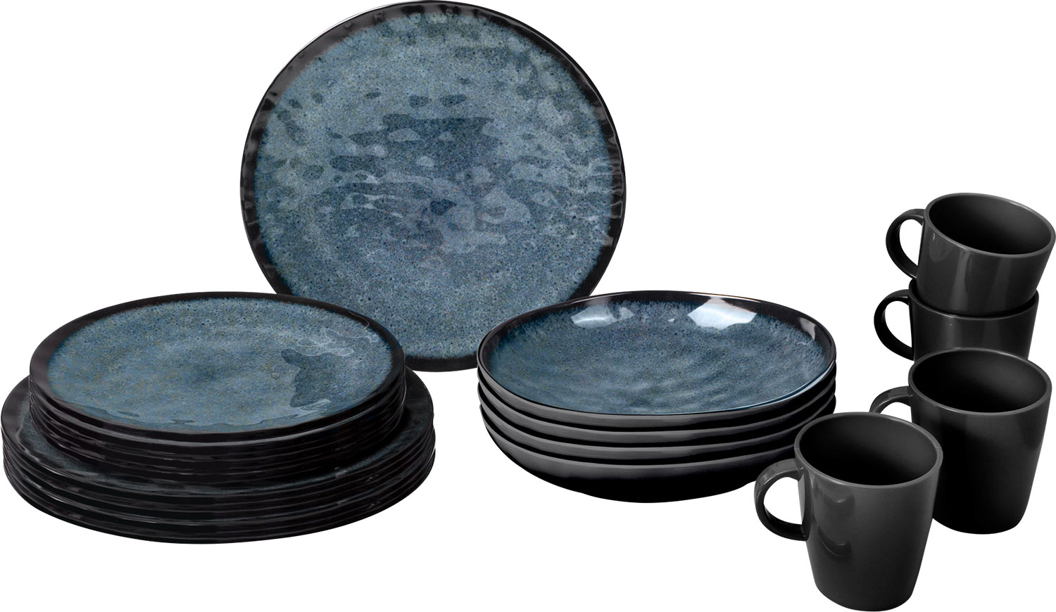 Hochwertiges Geschirr-Set in ansprechender Steingutoptik Das 16-teilige Geschirrset aus hochwertig verarbeitetem Melamin ist ideal für Camping und Outdoor-Aktivitäten. Das leichte Set in ansprechender Steingutoptik ist lebensmittelecht und bruchfest. Mit Anti-Slip-Beschichtung für extra Sicherheit und Langlebigkeit. Und das Beste: nach dem Essen können Sie sich entspannt zurücklehnen, denn das Set lässt sich ganz einfach in der Spülmaschine reinigen. Nicht für die Mikrowelle geeignet. Set besteht aus: 4 Essteller, Ø 25 cm 4 Suppenteller, Ø 21 cm 4 Schüsseln, Ø 21 cm 4 Henkelbecher, 300 ml Mikrowellengeeignet: Nein, Spülmaschinenfest: Ja, Material: Melamin, Ausführung: Venetian, Farbe: schwarz, blau, Gewicht: 3 kg