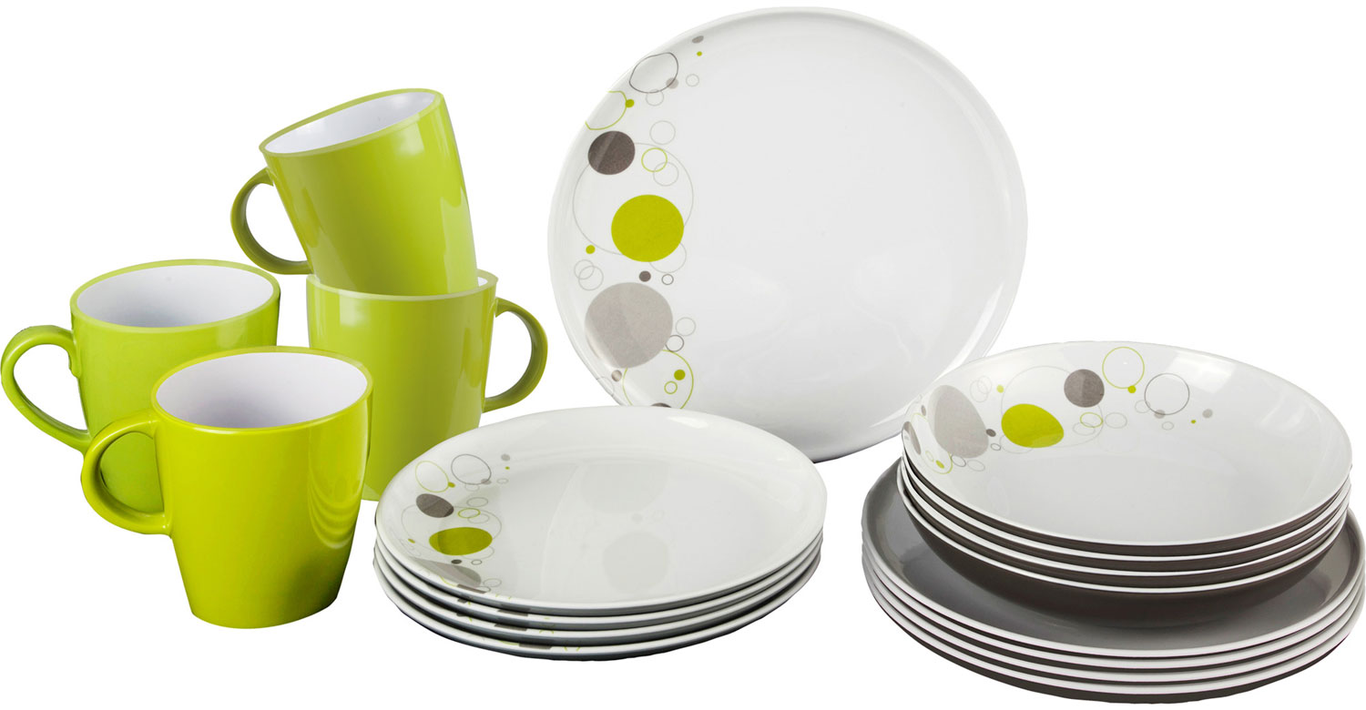 Das Space Melamin-Geschirrset ist aus bruchfestem, hochwertigem Melamin gefertigt und eignet sich perfekt für alle Outdoor- und Indoor-Aktivitäten wie Wohnmobil, Outdoor, Camping, Picknick und Garten. Die enthaltenen Teller und Becher verfügen über einen praktischen Anti-Rutsch- und Anti-Rassel-Ring, der speziell für den mobilen Einsatz geeignet ist. Dank der speziell entwickelten Form lassen sich alle Teller platzsparend stapeln und sicher aufbewahren. Das moderne, ansprechende Design lässt jeden Tisch elegant aussehen und schafft eine schicke Atmosphäre. Das Brunner Anti-Slip System: Durch einen im Tellerboden integrierten Antirutschring wird ein Verrutschen/Fallen des Geschirrs während der Fahrt vermieden. Außerdem wird das lästige Klappergeräusch der gestapelten Teller während der Fahrt deutlich reduziert. Das Space Melamin-Geschirrset besteht aus den folgenden 16 Teilen: * 4 Essteller Ø 25 cm * 4 Suppenteller Ø 21 cm * 4 Dessertteller Ø 20 cm * 4 Becher 300 ml Material: Alle Teller: Hochwertiger Melamin-Kunststoff – 100% Bisphenol-A-frei Alle Becher: Hitzebeständiges Resylin (100% ABS) – 100% Bisphenol-A-frei Eigenschaften von Brunner Melamin: * Oberfläche hart * Bruchfest * Porzellan-Optik * Formstabil * Lebensmittelecht * 100% Bisphenol-A-frei * Geschmacks- und geruchsneutral * Leicht zu reinigen * Spülmaschinenfest (keine industrielle Reinigung) * Zum Einfrieren geeignet * Nicht in der Mikrowelle verwenden Eigenschaften des Materials Resylin (Becher): * Lebensmittelecht * 100% BPA-frei * Hitzebeständig: Einsetzbar bis 95°C (kurzzeitig 100°C) * Bruchfest * Geeignet zum Einfrieren * Langlebig Durchmesser Dessertteller: 20 cm, Durchmesser Essteller: 25 cm, Durchmesser Suppenteller: 21 cm, Füllmenge Henkelbecher: 300 ml, Mikrowellengeeignet: Nein, Spülmaschinenfest: Ja, Farbe: weiß, grün, grau, Gewicht: 3,9 kg, Material: Melamin-Kunststoff – 100% BPA-frei / Resylin (100% ABS) – 100% BPA-frei, Maße (LxBxH): 34 x 28 x 14 cm