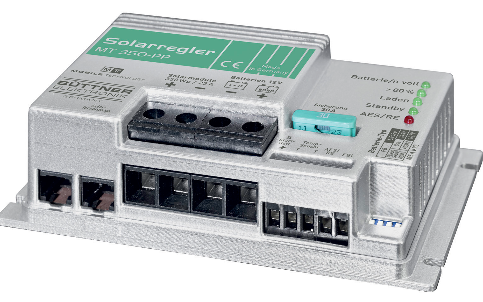 Hochwertige Solar-Laderegler „Made in Germany“ für optimale Batterieladung. Speziell für den Einsatz in Reisefahrzeugen entwickelt. Batterietyp individuell (Flüssig/Gel/AGM) einstellbar. Ausgestattet mit Temperaturfühler, Überladeschutz, Bordnetz-Filter und Zusatz-Ladeausgang für die Startbatterie. Batterie-Aktivierungs-Programm für Langzeitladung. 5 Jahre Herstellergarantie. INFO: Alle MT-Solarregler werden inklusive Batterie-Temperatursensor ausgeliefert, um zyklenfeste Bordbatterien (Flüssig/Gel/AGM) vorschriftsmäßig laden zu können; LED-Überwachung integriert; Anschlussmöglichkeit für MT-Solar-Fernanzeige und EBL-Anschlusskabelsatz (Option). Art Solaranlagen: Solarzubehör, Ausführung: MT 350PP, Kapazität (Ah): 350 Wp, Maße (BxHxT): 130 x 40 x 70 mm, Leistung: 350 Wp, Max. Modulstrom: 22 A