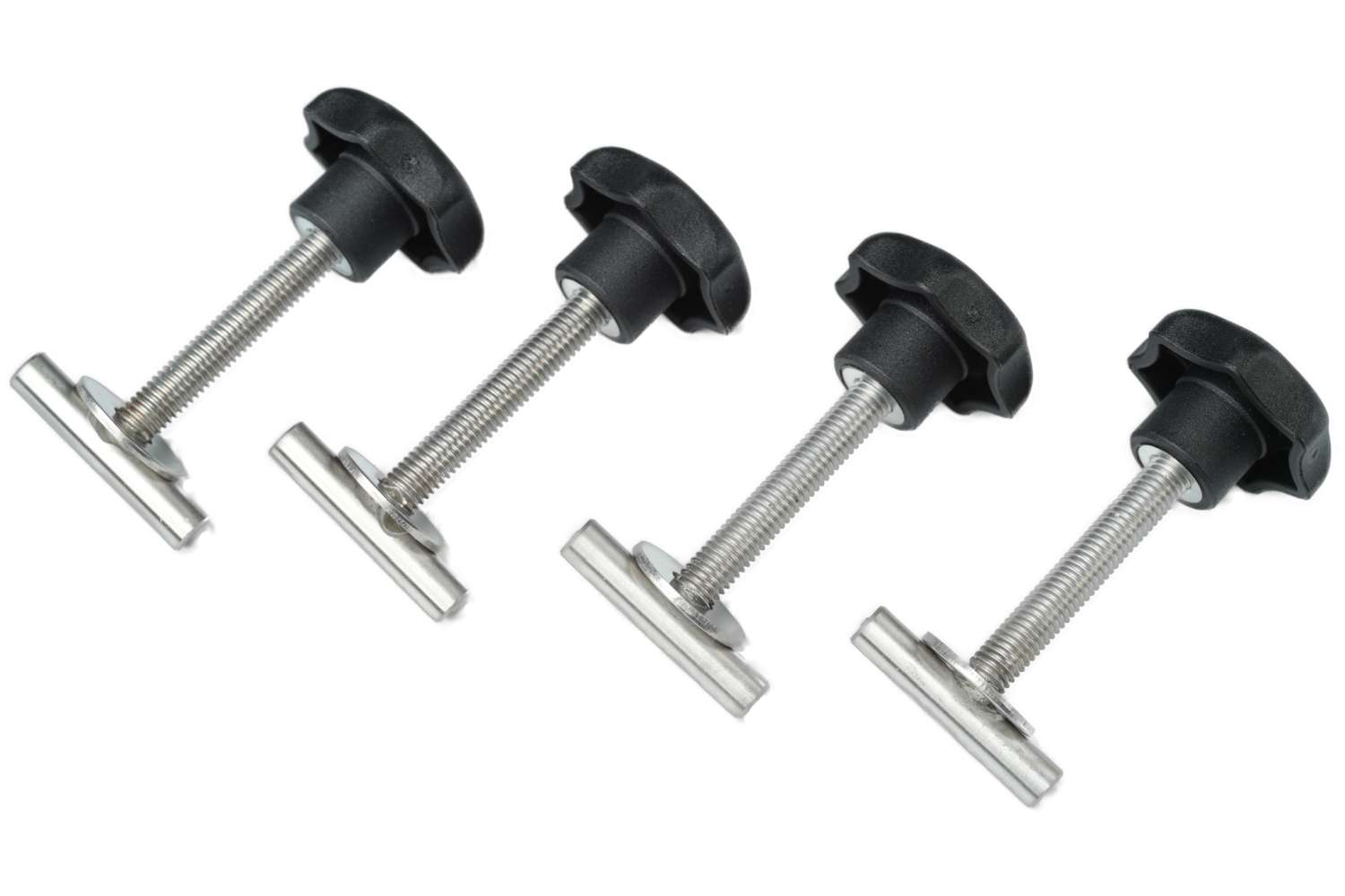 Mit den Halterungen und der Profilschiene kannst du beispielsweise Möbel in den Sitzschienen deines T5/T6/T6.1 befestigen. Zudem werden die Produkte als Befestigung für die Konsolen des Multiflexboard genutzt. Die Profilschiene kann mit den Halterungen kombiniert werden und ist genau auf die Größe der Sitzschienen im T5 / T6 / T6.1 angepasst. Zusätzlich dient die Halterung als extra Fixierung von Möbeln und hilft dir dabei, sie genau auszurichten und ihnen einen extra Halt zu geben. Details * 4 x T-Schrauben aus Edelstahl. Die Gewindelänge ist 60mm M8. * 4 x Sterngriffmuttern * 4 x große Beilagscheiben aus Edelstahl * Absolut Rostfrei Gewicht: 0,059 kg, Maße (LxBxH): 9,5 x 4 x 0,8 cm, Material: Edelstahl, 100% Polychlorid