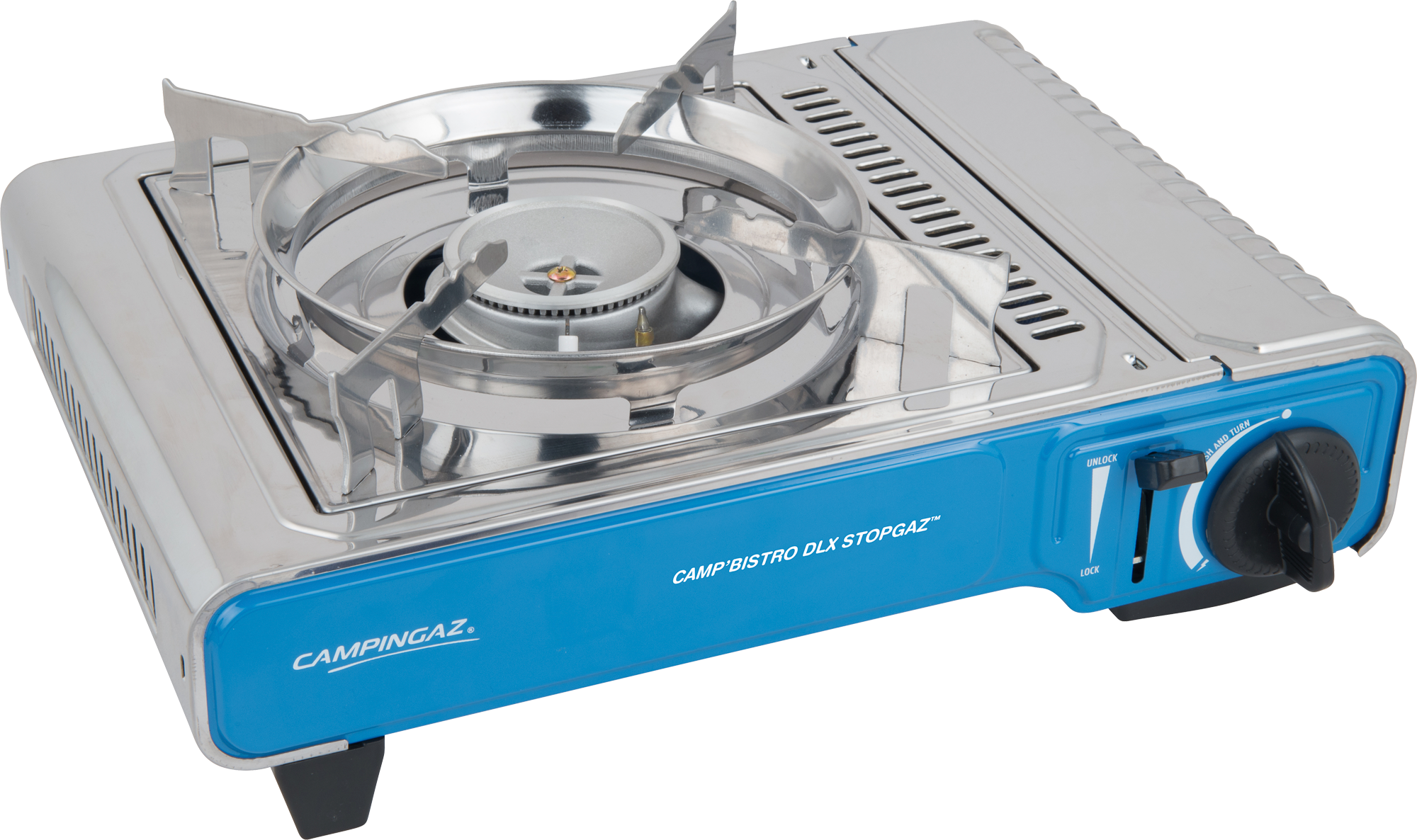 Der Camp’Bistro DLX mit Stopgaz ist das Modell der renommierten Camp’Bistro Campingkocher Serie und verfügt über einen überarbeiteten Topfträger, welcher in der Handhabung noch einfacher und komfortabler als der des Vorgängermodelles ist. Zum einfachen Transport und zur sicheren Lagerung wird der Einflamm-Gaskocher in einem Kunststoffkoffer geliefert. Die Hauptmerkmale im Überblick: * höchste Qualität von Campingaz * mit Stopgaz Technologie ausgestattet * einfach zu reinigender und langlebiger Edelstahl * Kartuschen „Safety-Lock“ System zur sicheren Handhabung * Leistung/Flammengröße fein regulierbar * Piezo-Zündung zum einfachen Zünden ohne Streichholz Technische Daten: * Siedezeit für 1 L Wasser: 5 Min. 50 Sek. * Zündung: Piezo (keine zusätzliche Zündquelle benötigt) * Brenndauer: 1 Std. 15 Min. * Gasart: der Kocher wird mit einer CP250 Campingaz Gaskartusche betrieben (separat erhältlich) * Lieferumfang: Transportkoffer Hinweis: Die Geräte sind nicht für den Einsatz in geschlossenen Räumen geeignet. Art Kocher: Kartuschenkocher, Gewicht: 1,7 kg, Piezo Zündung: Ja, Grillmodell: Koffergrill, Grillmodell: Tischgrill, Material Rost: Edelstahl, Piezo Zündung: Ja, Gasverbrauch max.: 160 g/h, Zündsicherung: Ja, Farbe: blau, Gasdruck: Kein Gasdruck, Maße (BxHxT): 37 x 13 x 30 cm, Maße Koffer (LxBxH): 39,2 x 32,4 x 13,1 cm, Leistung (W): 2,2 kW, Anzahl-Brennstellen: 1 Flamme