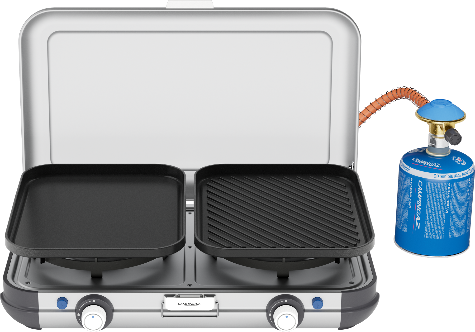 Camping Gaz Camping Kitchen 2 Grill & Go CV Der neue Camping Kitchen 2 Grill & Go CV ist ein kompakter und vielseitiger Koch- & Grillbegleiter. Der 2-Flammen-Herd mit abnehmbarem Grillrost und Planchaplatte gibt jederzeit die nötige Flexibilität verschiedene Gerichte zu kochen oder zu grillen. Egal, ob auf einem Abenteuer in der Natur oder mit Familie und Freunden bequem zu Hause, der Camping Kitchen 2 Grill & Go CV ist stets bereit. Der Kocher hat eine starke Leistung von 4000 W und eine optimale Wärmeverteilung auf beiden Grillflächen (über 250 °C). Er wird mit CV 470+ Kartusche (nicht inklusive) betrieben und verfügt damit über eine Laufzeit von 1 Std. 30 Min. Die Piezozündung ermöglicht einen einfachen Start und die Easy Clic™ Verbindung erleichtert die Anbringung und Abnahme der Kartusche. Nach der Nutzung lässt sich der Kocher dank der Fettablaufrinnen, der einfachen Abnahme der Grillaufsätze und der Antihaft-Beschichtung leicht reinigen. Die praktische Tragetasche ermöglicht im Anschluss einen problemlosen Transport egal, wohin der Weg führt. Maße: 49 x 45 x 33 cm Gewicht: 5,5 kg, Grillgeraete: Gas-Art, Grillgeraete: Leistung, Grillgeraete: Lieferumfang, Grillgeraete: Material, Grillmodell: Tischgrill, Kochstellen: 2 Kochstellen, Grillrost (LxB): 0 x 0 cm, Maße Koffer (LxBxH): 0 x 0 x 0 cm, Maße offen (LxHxT): 0 x 0 x 0 cm, Leistung (W): 4000 W
