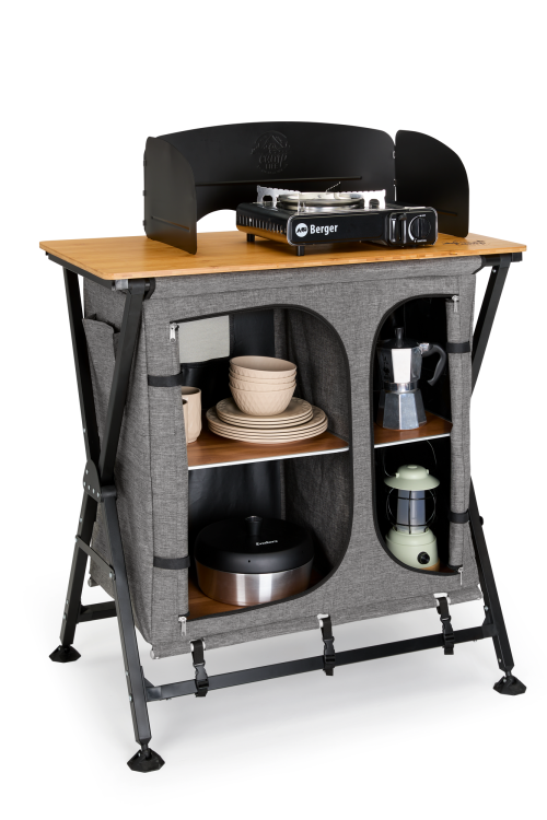 Die Samara M überzeugt mit stabilem Aluminiumgestell, Bambusdesign und cleveren Features wie Mesh-Belüftung und Seitentasche. Sie ist leicht zu transportieren und platzsparend zu verstauen. Praktisch als Campingküche oder Campingschrank einsetzbar. Technische Details: * Maße offen (BxHxT): 92 x 90/114 x 49 cm * Packmaße (BxHxT): 94 x 15 x 62 cm * Höhe mit Windschutz: 114 cm * Material Platte: Bambus * Material Einlageplatten: MDF in Bambusoptik * Material Bezug: recyceltes Polyester mit PCV-Beschichtung * Material Gestell: Aluminium, 25 x 25 mm * Gewicht: 10 kg Lieferumfang: * 1 Küchenbox * 1 Windschutz * 4 Einlegeböden * 1 Tragetasche Belastbar bis: 30 kg, Gewicht: 10 kg, Material Platte: Hartfaserplatte, Staufächer: 4 Stück