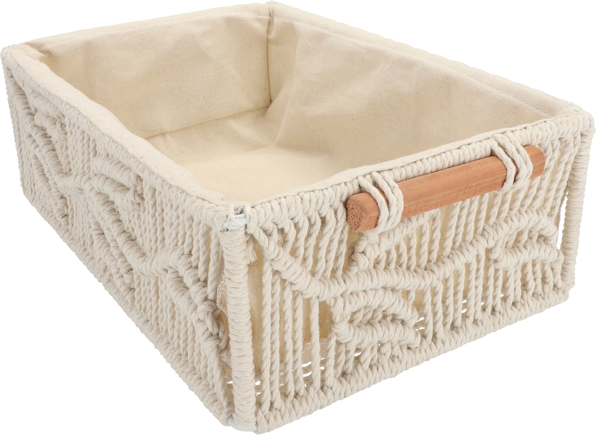 Der Alleskönner: Dein Markamee Mehrzweckkorb für jede Gelegenheit! Mit diesem Makramee Mehrzweckkorb kannst du nicht nur deine Sachen ordentlich aufbewahren, sondern auch einen Hauch von Boho-Chic auf den Campingplatz oder dein Zuhause bringen. Entdecke jetzt unsere handgefertigten Körbe und bereichere deine Einrichtung mit einem Hauch von Natürlichkeit! * Vielseitig einsetzbar: Perfekt für die Aufbewahrung von Zeitschriften, Decken, Spielzeug oder Pflanzen. * Robust und langlebig: Der Metallrahmen sorgt für Stabilität und das Baumwollseil für eine lange Lebensdauer. * Stilvoll und dekorativ: Das Makramee-Design verleiht jedem Raum eine gemütliche und moderne Atmosphäre. Produktdetails: * Gewicht: 550 g * Maße: 33 x 20 x 10 cm * Material: Baumwollseil, Metallrahmen, Baumwollstoff & Holzgriff Lieferumfang: * 1 x Mehrzweckkorb Deko nicht im Lieferumfang enthalten. Ausführung: Mehrzweckkorb, Material: Baumwolle