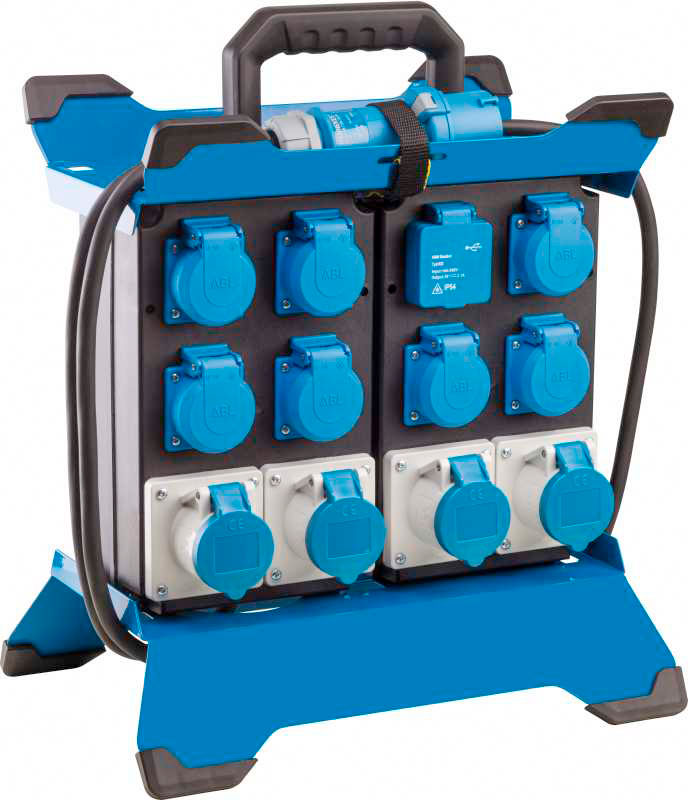 Stromverteiler STECKY DUO 5 mit großem handlichem Tragegriff. Standsicheres Metallgestell mit Kantenschutz. Eingang: 3,4m schwere Gummischlauchleitung H07RN-F 3G2,5 mit CEE-Stecker 230V/16A/3polig Ausgang: 4 x CEE-Steckdose 230V/16A/3polig mit Klappdeckel 2x USB-Port 5V, 2,1A + 7 x Schutzkontaktsteckdose 230V/16A mit Klappdeckel230V/16A/max. 3.500W Absicherung: 1x FI 25 A, 30 mA, Typ A Schutzart: IP44 (Geschützt gegen feste Fremdkörper mit Ø ≥ 1,0 mm, Schutz gegen allseitiges Spritzwasser) Art Kabel, Kupplung, Schalter und Stecker: Sonstiges