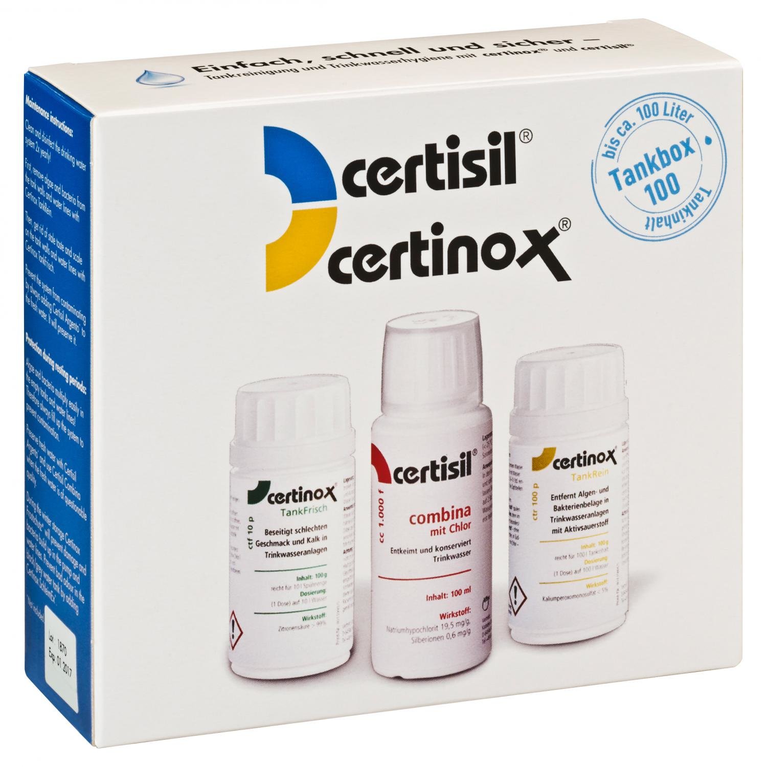 Für Sie haben wir die certibox, das Komplettpaket zur Reinigung und Desinfektion für Trinkwasser, Tank und Leitungen zusammengestellt. certinox zur Reinigung und certisil zur Desinfektion sind aufeinander abgestimmt und für Tankgrößen von 100 und 250 l ausgelegt. Alles aus einer Hand, das gibt Sicherheit! certibox 100 Set. certinox tankrein, 1 Flasche mit 100 g, certinox tankfrisch, 1 Flasche mit 100 g, certisil combina (BAUA-REG-Nr.: N-58047), 1 Flasche mit 100 ml reicht zur Desinfektion eines 100 Liter Tanks und um 600 Liter Wasser zu desinfizieren und frisch zu halten certibox 250 Set. certinox tankrein, 1 Flasche mit 250 g, certinox tankfrisch, 1 Flasche mit 250 g certisil combina (BAUA-REG-Nr.: N-58047), 1 Flasche mit 100 ml reicht zur Desinfektion eines 250 Liter Tanks und um weitere 9.000 Liter Wasser zu desinfizieren und frisch zu halten. Reicht für: 100 l Tanks