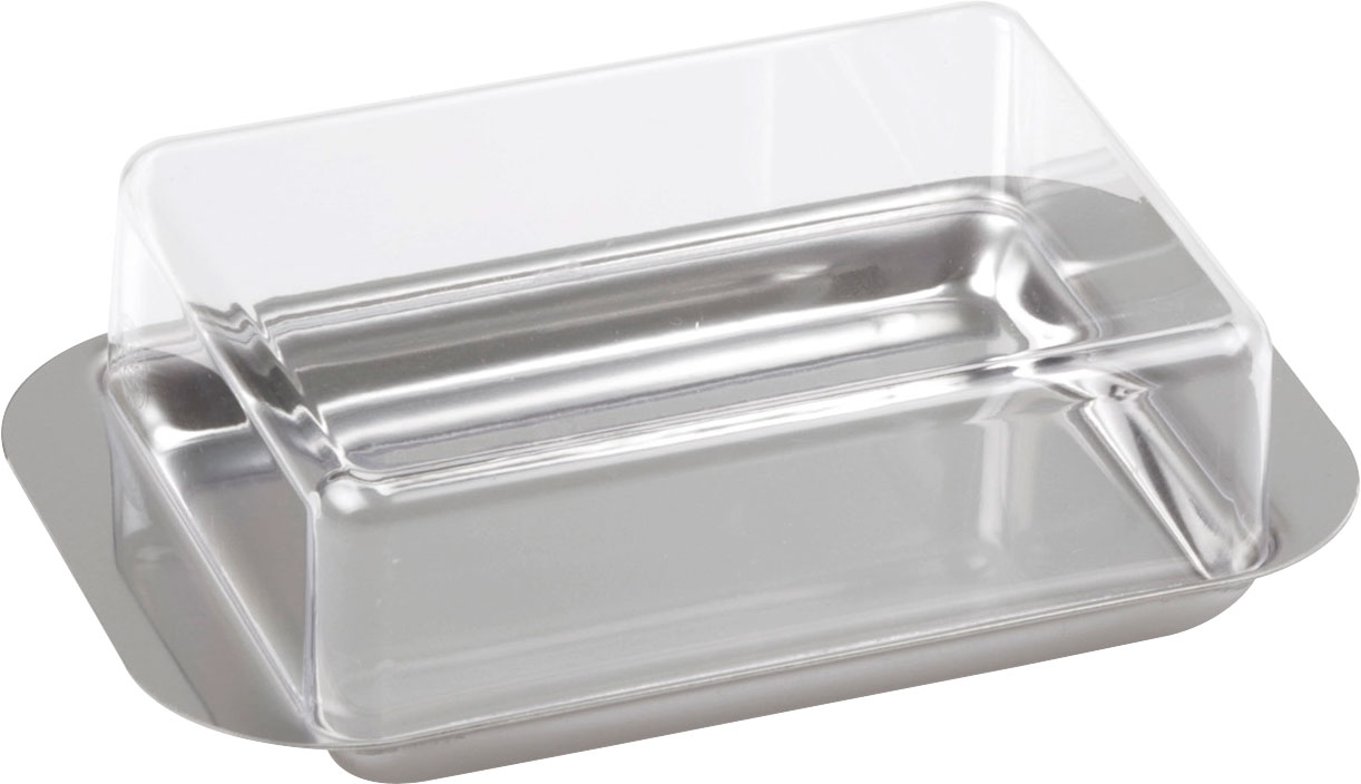 Diese schlichte und zeitlose Butterdose passt auf jeden schön gedeckten Tisch. Durch den klaren Deckel sehen Sie genau, wie viel Butter noch da ist und bewahren sie praktisch und geschützt auf. Deutsches Markenprodukt! Art Kühlschränke: Zubehör, Farbe: transparent, edelstahl, Material: Edelstahl, transparenter Kunststoff, Maße offen (LxBxH): 15 x 9,5 x 4,5 cm