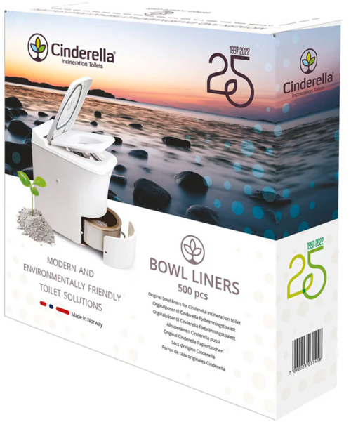 Cinderella Bowl liner 500 Stück Die originalen Cinderella Bowl liner sind speziell für Cinderella entwickelt und unverzichtbar für den hygienischen Betrieb der Verbrennungstoilette. Sie bestehen aus ungebleichtem, braunem Kraftpapier mit einer dünnen, wasserdichten LDPE-Beschichtung (Polyethylen niedriger Dichte) auf der Innenseite. Diese verhindert das Austreten von Feuchtigkeit und gewährleistet den sicheren Transport des Abfalls in die Verbrennungskammer. Die Liner verbrennen rückstandsfrei und werden in Norwegen unter hohen Umwelt- und Qualitätsstandards produziert. Details * Passend für Cinderella Verbrennungstoiletten * Aus ungebleichtem Kraftpapier, FSC- und PEFC-zertifiziert * Mit wasserdichter LDPE-Beschichtung (Polyethylen niedriger Dichte) * Sicherer, hygienischer Abfalltransport ohne Wasser * Rückstandsfreie Verbrennung bei 500–600 °C * Produziert in Norwegen unter nachhaltigen Bedingungen Technische Daten * Inhalt: 500 Papierbeutel * Material: Kraftpapier mit LDPE-Beschichtung (Polyethylen niedriger Dichte) * Gewicht der Folie: 10 g/m² * Schmelzpunkt der Folie: 110–115 °C * Verbrennungstemperatur: 500–600 °C Lieferumfang * 500 original Cinderella Papierbeutel Passend für: Cinderella Classic, Comfort, Freedom, Jubilee und Premium, Verpackungseinheit: 500 Stück