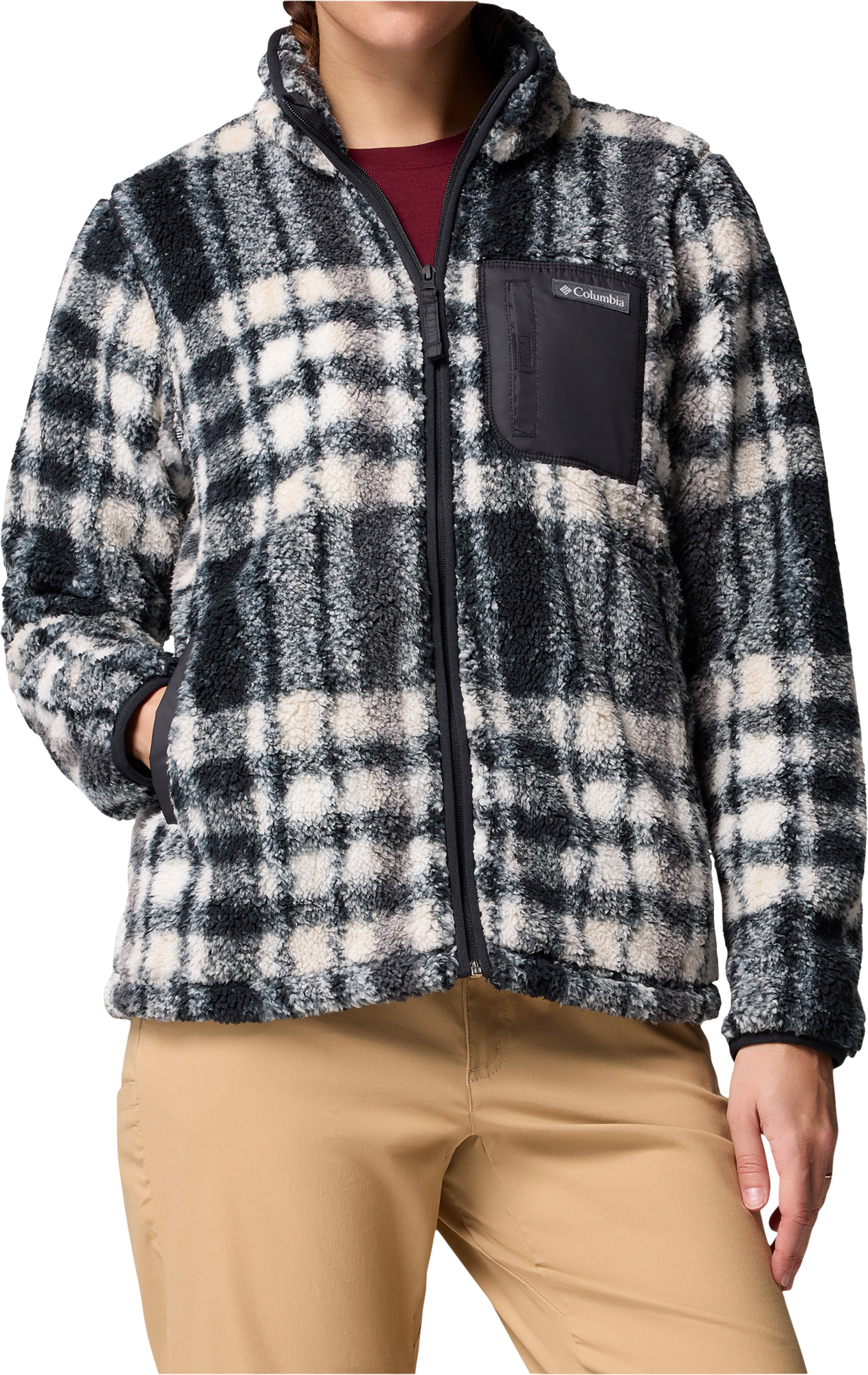 Columbia West Bend II Sherpa Jacke mit Print für Frauen Die Columbia West Bend II Sherpa Jacke vereint kuscheligen Komfort mit stylischem Design. Das weiche Fleece hält dich angenehm warm und sorgt für ein gemütliches Tragegefühl im Alltag. Durch den modernen Allover-Print erhält die Jacke einen individuellen Look, der perfekt zu urbanen Aktivitäten oder entspannten Spaziergängen passt. Dank figurnaher Schnittführung genießt du optimale Bewegungsfreiheit und eine schmeichelnde Silhouette. In den praktischen Hand- und Brusttaschen kannst du deine wichtigsten Essentials sicher verstauen. Details: * Weiches Fleece für Wärme und hohen Tragekomfort * Stylischer Allover-Print für einen individuellen Look * Figurnahe Schnittführung für Bewegungsfreiheit und eine günstige Silhouette * Praktische Hand- und Brusttaschen für unterwegs * Kuschelig weich und angenehm zu tragen * Ideal für Alltag, Gehen und urbane Aktivitäten Technische Daten: * Material: 100 % recyceltes Polyester, Fleece: 100 % Polyester * Passform: Figurnah * Taschen: Hand- und Brusttaschen * Hintere Länge in der Mitte: 66 cm * Einsatzbereiche: Gehen, Alltag, urbane Aktivitäten Lieferumfang: * 1 x Columbia West Bend II Sherpa Jacke mit Print für Frauen Art Jacken: Fleecejacke, Geschlecht: Damen, Material: 100% Polyester (recycelt), Farbe: black herringplaid, Größe: XL