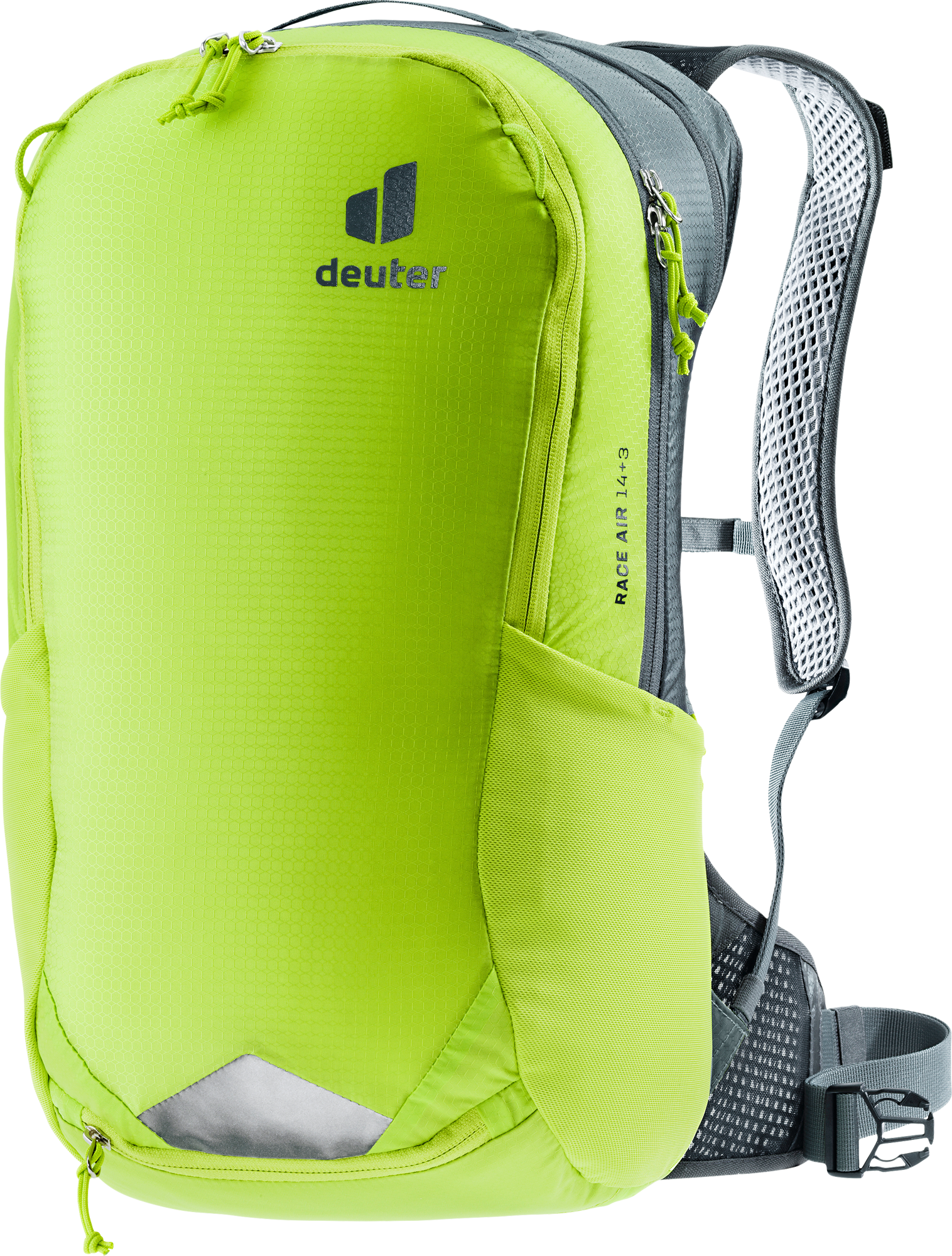 Der Deuter Race Air 14+3 ist ein extrem leichter und stabiler Fahrradrucksack, der speziell für sportliche Mountainbiker*innen entwickelt wurde. Dank des innovativen Aircomfort Rückensystems mit mittig geteiltem Netzrücken genießt du optimale Belüftung – für ein angenehmes Tragegefühl auch auf langen Touren. Der Rucksack überzeugt zudem durch seine hervorragende Gewicht-Komfort-Ratio, einen stufenlos verstellbaren Brustgurt sowie Netzhüftflossen, die für einen sicheren und komfortablen Sitz sorgen. Details: * Leicht & komfortabel: * Hervorragende Gewicht-Komfort-Ratio * Aircomfort Rückensystem mit geteiltem Netzrücken für optimale Belüftung * Belüftete, perforierte Schulterträger * Stufenlos verstellbarer Brustgurt und Netzhüftflossen * Großes Innenfach, Netz-Seitentaschen und Reißverschlusstasche oben * Organisationseinheit für Werkzeug und Vortasche, RV-Netztasche für Schlauch, Werkzeug und Pumpenhalterung * Vorrichtung für eine Trinkblase bis 3,0 Liter * Elastische Seitentaschen, integriertes Helmnetz, Regenhülle und Stretch-Innenfach * Seitliches Handyfach, Brillenhalterung, Schlüsselclip, Volumenerweiterung, Reflektierende Elemente Material: * 100 % recyceltem Polyamid (100D recyceltes Polyamid High Tenacity Bright), bluesign-zertifiziert, PFAS-frei und klimaneutral Lieferumfang: * 1 x Deuter Race Air 14+3 Fahrradrucksack Art Rucksäcke: Tagesrucksack, Volumen erweiterbar: 3 l, Gewicht: 940 g, Material: 100D Polyamid, Nasswäschefach: Ja, Regenhülle: Ja, Volumen: 14 l, Farbe: Grün, Maße (LxBxH): 18 x 25 x 46 cm