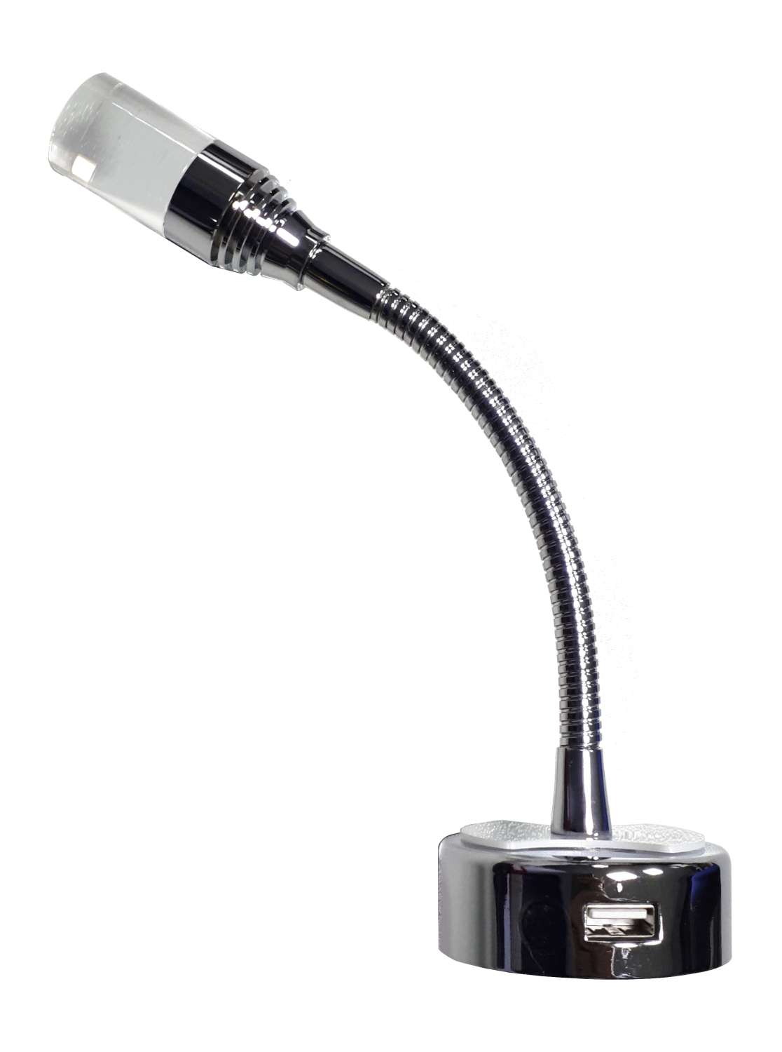 Leseleuchte Flexi LED 1 W. Leuchtmittel: LED, Packmaß (LxBxH): 34 x 10 x 5 cm, Maße (LxBxH): 6 x 6 x 205 cm, Leistung (W): 1 W, Lichtfarbe: 3000 K, Material: Metall / Acryl, Ausführung: mit Schalter und 2.1 Ampere USB Steckdose in Chrom, EPREL-Nummer: 1002558, Farbe: chrom, Gewicht: 0,18 kg