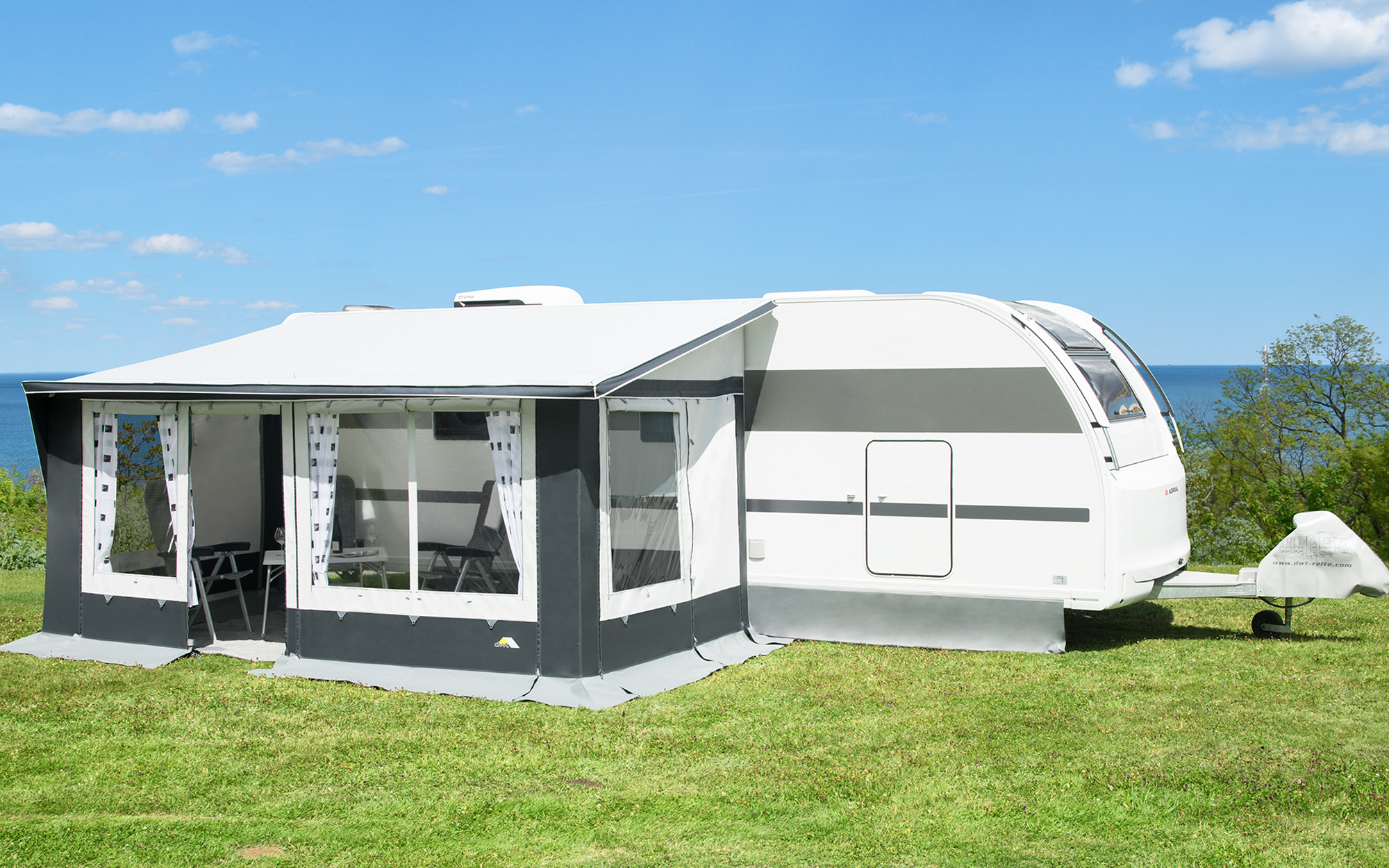 dwt Juwel 4 Seasons Pultdach-Teilzelt – Stabiler Ganzjahres-Wetterschutz mit Komfortausstattung Das dwt Juwel 4 Seasons ist ein hochwertiges Pultdach-Teilzelt für alle Jahreszeiten. Mit seinem beidseitig kunststoffbeschichteten Polyestergewebe bietet es dauerhaften Schutz vor Wind, Regen und Sonne. Herausnehmbare Wände, versetzbare Türen und UV-absorbierende Fenster sorgen für hohen Komfort und flexible Nutzung. Dank des stabilen Stahlgestänges mit Andruckstangen, Schaumstoffwülsten und doppelten Windecken steht das Zelt auch bei Sturm sicher und dicht – ideal für lange Camping-Saisons. Details: * Für Wohnwagen mit einer Höhe von 240 – 258 cm * Zelttiefe ca. 240 cm, Vordachtiefe ca. 25 cm * Dach, Wände und hochgezogener Spritz- und Erdstreifen aus hochwertigem, beidseitig kunststoffbeschichtetem Polyestergewebe * (Polyvinylchlorid-beschichtet), wetterfest und komplett abwaschbar * Fenster aus UV-absorbierender Folie (ca. 90 %), mit Klappen und Reißverschlüssen verschließbar * Vorderwand herausnehmbar, zur Veranda abklappbar, Vorderwandhälften austauschbar, Tür versetzbar * Größe 1–3 mit zwei Fenstern, Größe 4–6 mit zwei Fenstern und Eingangstür * Seitenwände herausnehmbar, austauschbar, Eingangstür hochrollbar * Große Lüftungsfenster (½ Gaze, ½ Klarfolie) mit doppelter Fensterklappe * Alle Reißverschlüsse mit zusätzlicher Abdeckung * Eingenähte Schaumstoffwülste für dichte Verbindung am Wohnwagen * Hochentlüftung für bessere Luftzirkulation * Waagerechte und senkrechte Hohlsäume mit Klettverschlüssen * Doppelte Windecken, stabile Sturmlaschen und Vorbereitung für Sicherheitsgurt * Gardinen mit Keder und Röllchen * Optionales Verandadach mit Tiefe von ca. 270 cm, Anbringung über Keder und Doppelkederschiene * Vario-Clip-System für schraublose Montage (optional) Technische Daten: * Gestänge: Stahlrohr, Durchmesser 28 x 1 mm, inkl. 2 Andruckstangen * Zelttiefe: ca. 240 cm * Vordachtiefe: ca. 25 cm * Größe 1 links: Teileinzugmaß 520 – 540 cm, Bodenmaß 310 x 240 cm * Größe 2 links: Teileinzugmaß 570 – 590 cm, Bodenmaß 360 x 240 cm * Größe 3 links: Teileinzugmaß 600 – 620 cm, Bodenmaß 390 x 240 cm * Größe 4 links: Teileinzugmaß 630 – 650 cm, Bodenmaß 420 x 240 cm * Größe 5 links: Teileinzugmaß 660 – 680 cm, Bodenmaß 450 x 240 cm * Größe 6 links: Teileinzugmaß 700 – 720 cm, Bodenmaß 490 x 240 cm * Größe 1 Mitte: Bodenmaß 300 x 240 cm * Größe 2 Mitte: Bodenmaß 350 x 240 cm * Größe 3 Mitte: Bodenmaß 380 x 240 cm * Größe 4 Mitte: Bodenmaß 410 x 240 cm * Größe 5 Mitte: Bodenmaß 440 x 240 cm * Größe 4 rechts: Teileinzugmaß 610 – 630 cm, Bodenmaß 420 x 240 cm * Größe 5 rechts: Teileinzugmaß 640 – 660 cm, Bodenmaß 450 x 240 cm * Größe 6 rechts: Teileinzugmaß 680 – 700 cm, Bodenmaß 490 x 240 cm Lieferumfang: * Zelthaut * Gestänge mit Andruckstangen * Gardinen * Abspannmaterial * Rad- und Windblende * 1 Packsack * 2. Packsack für Gestänge Art Wohnwagenvorzelte: Ganzjahresvorzelt, aufblasbar: Nein, Farbe: dunkelgrau, Material: Polyester, Typ Vorzelt: Teilvorzelt, Abgedeckte Reissverschlüsse: Ja, Fensterklappe außen: Ja, Giebelhochentlüftung: Ja, Moskitonetz: Ja, Seitenwand herausnehmbar: Ja, Sturmabspannung: Ja, Verandaeffekt: Ja, Vordach: Ja, Vorderwand herausnehmbar: Ja, Zusätzlicher Seiteneingang: Ja, Ausführung: links, Gewicht: 45 kg, Anbauhöhe (von – bis): 240 – 258 cm, Maße (BxT): 390 x 240 cm, Umlaufmaß bis: 600 cm, Umlaufmaß von: 620 cm