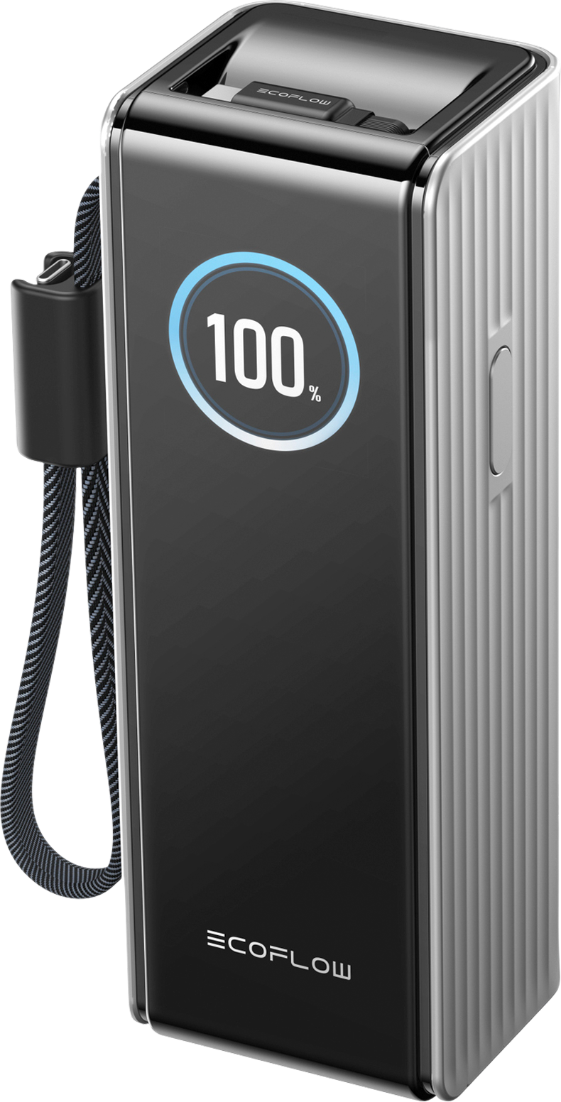 EcoFlow Rapid Powerbank – Kompakt laden mit 170 W Leistung und 25.000 mAh Kapazität Mit der EcoFlow Rapid Powerbank lädst Du unterwegs Smartphones, Tablets oder Laptops schnell und zuverlässig. Du kannst zwischen zwei Varianten wählen: Eine mit zwei integrierten USB-C-Kabeln (je 100 W) oder eine klassische Version ohne Kabel mit bis zu 140 W pro Port. Beide Modelle bieten drei Ausgänge, ein robustes Gehäuse und ein übersichtliches TFT-Display. Kabelloses Laden und App-Steuerung sind nicht enthalten – dafür erhältst Du maximale Ladeleistung bei kompakten Abmessungen. Details: * Integrierte bzw. ausziehbare USB-C-Kabel (modellabhängig) * Bis zu 170 W Gesamtausgangsleistung * TFT-Display mit Ladeinformationen * Sturzfest bis 1 m * Feuerfestes Gehäuse (V0 klassifiziert) * Kabelloses Laden und App-Steuerung nicht unterstützt Technische Daten: * Gesamtkapazität: 25.000 mAh * Batteriekapazität: 14.500 mAh * Maße: 157 × 53,8 × 48,8 mm * Gewicht: ca. 580 g (mit Kabeln) bzw. 565 g (ohne Kabel) * Batteriechemie: ternäres Lithium * Lebenszyklus: 300 Zyklen bis 80 % * Ausgänge (mit Kabeln): 3x USB-C (je 100 W), 1x USB-A (18 W) * Ausgänge (ohne Kabel): 2x USB-C (140 W), 1x USB-A (33 W) * Eingang: USB-C bis 100 W (mit Kabeln) bzw. 140 W (ohne Kabel) * Unterstützte Ladeprotokolle: BC1.2, Apple 2,4 A, QC3.0, FCP, SCP, AFC, UFCS, PD3.1, PPS * Sturzsicher: bis 1 m * Betriebstemperatur: 20 °C bis 30 °C * Lade-/Entlade-/Lagertemperatur: –10 °C bis 45 °C Lieferumfang: * 1x EcoFlow Rapid Powerbank 25.000 mAh (mit oder ohne integrierte Kabel, je nach Variante) Ausführung: mit 2 integrierten 100 W Kabeln, Breite: 53,8 mm, Farbe: silber, Gewicht: 580 g, Höhe: 48,8 mm, Kapazität (Ah): 25000 mAh, Länge: 157 mm