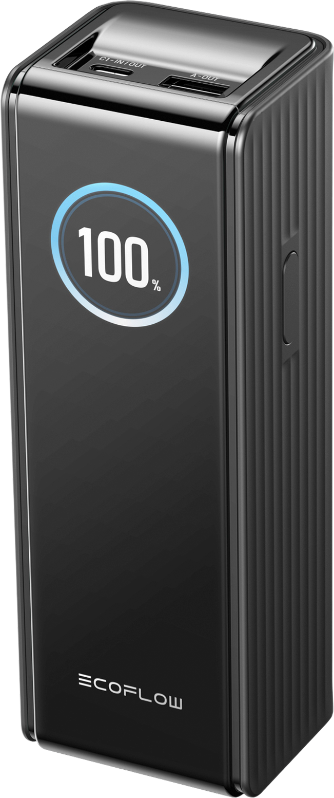 EcoFlow Rapid Powerbank – Kompakt laden mit 170 W Leistung und 25.000 mAh Kapazität Mit der EcoFlow Rapid Powerbank lädst Du unterwegs Smartphones, Tablets oder Laptops schnell und zuverlässig. Du kannst zwischen zwei Varianten wählen: Eine mit zwei integrierten USB-C-Kabeln (je 100 W) oder eine klassische Version ohne Kabel mit bis zu 140 W pro Port. Beide Modelle bieten drei Ausgänge, ein robustes Gehäuse und ein übersichtliches TFT-Display. Kabelloses Laden und App-Steuerung sind nicht enthalten – dafür erhältst Du maximale Ladeleistung bei kompakten Abmessungen. Details: * Integrierte bzw. ausziehbare USB-C-Kabel (modellabhängig) * Bis zu 170 W Gesamtausgangsleistung * TFT-Display mit Ladeinformationen * Sturzfest bis 1 m * Feuerfestes Gehäuse (V0 klassifiziert) * Kabelloses Laden und App-Steuerung nicht unterstützt Technische Daten: * Gesamtkapazität: 25.000 mAh * Batteriekapazität: 14.500 mAh * Maße: 157 × 53,8 × 48,8 mm * Gewicht: ca. 580 g (mit Kabeln) bzw. 565 g (ohne Kabel) * Batteriechemie: ternäres Lithium * Lebenszyklus: 300 Zyklen bis 80 % * Ausgänge (mit Kabeln): 3x USB-C (je 100 W), 1x USB-A (18 W) * Ausgänge (ohne Kabel): 2x USB-C (140 W), 1x USB-A (33 W) * Eingang: USB-C bis 100 W (mit Kabeln) bzw. 140 W (ohne Kabel) * Unterstützte Ladeprotokolle: BC1.2, Apple 2,4 A, QC3.0, FCP, SCP, AFC, UFCS, PD3.1, PPS * Sturzsicher: bis 1 m * Betriebstemperatur: 20 °C bis 30 °C * Lade-/Entlade-/Lagertemperatur: –10 °C bis 45 °C Lieferumfang: * 1x EcoFlow Rapid Powerbank 25.000 mAh (mit oder ohne integrierte Kabel, je nach Variante) Ausführung: ohne integrierte 100 W Kabel, Breite: 53,8 mm, Farbe: schwarz, Gewicht: 565 g, Höhe: 48,8 mm, Kapazität (Ah): 25000 mAh, Länge: 157 mm