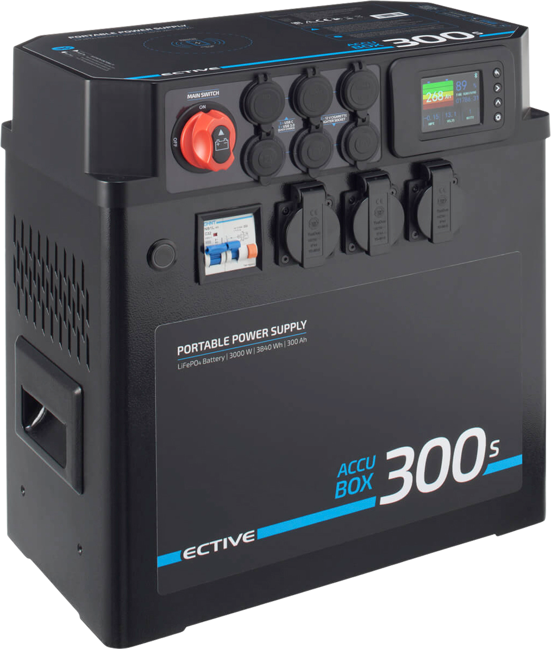 Die ECTIVE AccuBox vereint maximale Leistung mit uneingeschränkter Mobilität. Folgende Merkmale hat die Accubox 120S: 120 Ah/ 200S: 200Ah/ 300S: 300Ah LiFePO4-Lithiumbatterie, 3000 W Wechselrichter mit reiner Sinuswelle, Display und Bluetooth-App, Induktives Laden für dein Smartphone, 15 Anschlussmöglichkeiten u. A. USB C und A, Ladebooster zum Laden während dem Fahren, MPPT-Solarladeregler für nachhaltiges Laden, Batterie-Management-System zum Schutz vor Tiefenentladung uvm., FI-Sicherung für maximalen Schutz, 3 Jahre Hersteller-Garantie Powerstation ECTIVE AccuBox 120S ECTIVE AccuBox 200S ECTIVE AccuBox 300S Dauerleistung 3000 W 3000 W 6000 W Max. Leistung bis 10 s 4500 W 4500 W 4500 W IP-Schutzklasse IP20 IP20 IP20 Anschlüsse 1 x 175A Anderson-Anschluss 1 x 175A Anderson-Anschluss 1 x 175A Anderson-Anschluss Lademöglichkeit Netzladegerät/Solarladeregler (integriert)/Ladebooster (integriert) Solarmodul-Leistung 700 Wp 700 Wp 700 Wp Solarmodul-Strom 40 A 40 A 40 A MPPT Ladestorm 40 A 40 A 40 A Solarmodul-Spannung 90 V 90 V 90 V Anschlüsse 2x 50 A Anderson 2x 50 A Anderson 2x 50 A Anderson Anschlüsse 3x 230V Schuko-Steckdose 3x 230V Schuko-Steckdose 3x 230V Schuko-Steckdose Betriebstemeratur -10 °C bis 50 °C -10 °C bis 50 °C -10 °C bis 50 °C Ladeleistung AC-Eingangsleistung max. 292 W AC-Eingangsleistung max. 292 W AC-Eingangsleistung max. 292 W Schutzsicherung 2x 50A ANS (50A Anderson)/200A ANS(175A Anderson) 2x 50A ANS (50A Anderson)/200A ANS(175A Anderson) 2x 50A ANS (50A Anderson)/200A ANS(175A Anderson) Schutzsicherung 2x 30A (DC/USB)/50A (Solar/Ladebooster) 2x 30A (DC/USB)/50A (Solar/Ladebooster) 2x 30A (DC/USB)/50A (Solar/Ladebooster) Art Batterie: Powerbank, Ausführung: 300s, Kapazität (Ah): 300 Ah, Maße (LxBxH): 420 x 265 x 430 mm, Batteriekapazität: 3.840 Wh, Ladestrom: 14,8 V, Spannung: 230 V, Leistung: 4500 W