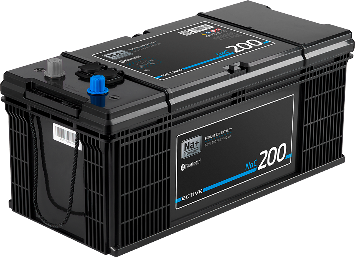 Ective NaC BT Natrium Versorgungsbatterien – Nachhaltige Energie für autarkes Reisen Mit den Ective NaC Versorgungsbatterien genießt du zuverlässige Stromversorgung auf Basis moderner Natrium-Ionen-Technologie. Sie sind langlebig, sicher und perfekt für Wohnmobil, Caravan, Boot oder Tinyhaus geeignet. Dank Bluetooth 7.0 und der connECTIVE App hast du alle Werte immer im Blick – selbst bei Kälte oder langen Standzeiten. Details: * Natrium-Ionen-Technologie – ressourcenschonend, sicher und umweltfreundlich * Bis zu 10.000 Ladezyklen (30 % DoD) und 100 % nutzbare Kapazität * Hohe Entladeströme für Geräte wie Klimaanlagen oder Induktionskochfelder * CoreTech BMS mit Zellschutz, passivem Balancing und integriertem Ein-/Aus-Schalter * Bluetooth 7.0 mit connECTIVE App zur Echtzeitüberwachung * CAN-Bus-Anbindung zur Integration in die Fahrzeugelektronik * Reihenschaltung von bis zu 4 Batterien möglich * Extrem niedrige Selbstentladung – ideal für lange Standzeiten * Einsatzfähig bis –20 °C, ladbar bis –10 °C, keine Heizplatten nötig * Endpolart SAE, nahezu wartungsfrei und leichter als Blei * ECE R10-zertifiziert für sicheren Betrieb im Fahrzeug Technische Daten: * Batterietechnologie: Natrium-Ionen * Spannung: 12 V * Gefahrgutklasse: 9 (UN 3551) * Batteriemanagementsystem: Integriert (CoreTech BMS, passives Zellbalancing) * Bluetooth-Funktion: Ja (Version 7.0 mit connECTIVE App) * Betriebsbereiche: * Entladung –20 °C bis +55 °C * Ladung –10 °C bis +45 °C * Lagerung –20 °C bis +45 °C * NaC 100 BT 12 V Natrium Versorgungsbatterie 100 Ah * Kapazität: 100 Ah (1200 Wh) * Maße (L x B x H): 398 x 175 x 188 mm * Gewicht: 18,20 kg * Max. konstanter Entladestrom: 100 A * Spitzenentladestrom: 1000 A * Empfohlene Ladespannung: 15,8 V * Empfohlener Ladestrom: 50 A * Entladezeit bei 25 A: 240 min * NaC 200 BT 12 V Natrium Versorgungsbatterie 200 Ah * Kapazität: 200 Ah (2400 Wh) * Maße (L x B x H): 522 x 238 x 235 mm * Gewicht: 26,40 kg * Max. konstanter Entladestrom: 200 A * Spitzenentladestrom: 1500 A * Empfohlene Ladespannung: 15,8 V * Empfohlener Ladestrom: 100 A * Entladezeit bei 25 A: 480 min Lieferumfang: * Ective NaC 100 BT oder NaC 200 BT Natrium Versorgungsbatterie * Bedienungsanleitung Batterie Bauart : Natrium-Ionen-Batterien, Spannung: 12 V, Akku-Nennleistung (Wh): 2400 , Gewicht: 26,4 kg, Kapazität (Ah): 200 Ah