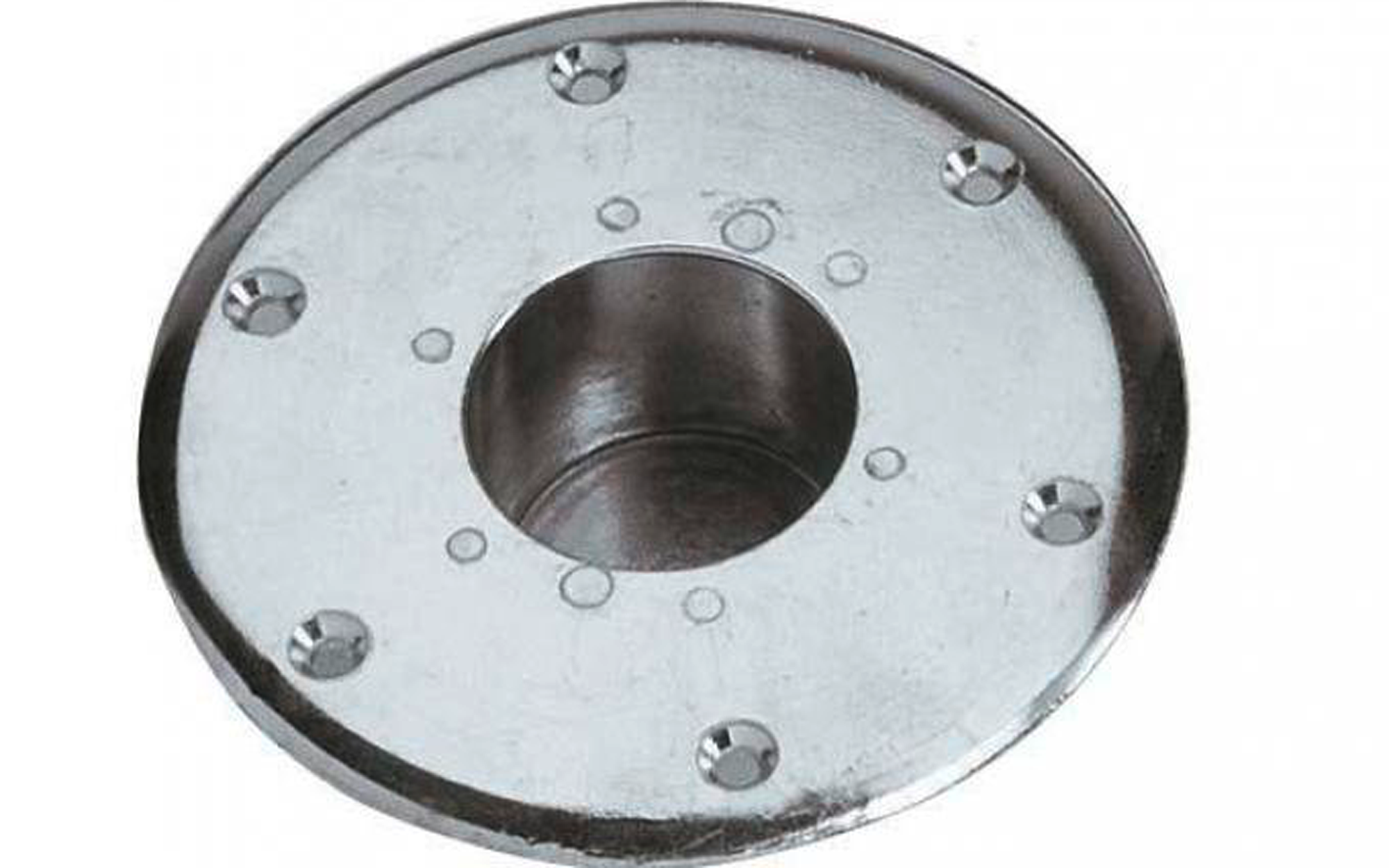 Einlaß-Rosette für Stecktischfuß aus Leichtmetall Durchmesser: Ø 160 mm Einbautiefe: 45 mm Rohr-Aussendurchmesser: 57 mm Art Tischgestelle: Zubehör, Material: Leichtmetall, Farbe: silber