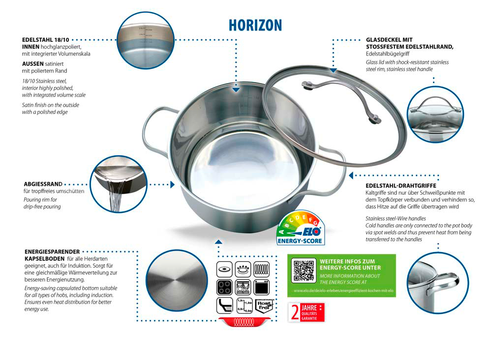 Horizont erweitern gefällig? Ganz einfach: alte Töpfe raus, Horizon Topfset rein und schon öffnen sich neue (Küchen-) Horizonte! Die Lust, neue Rezepte und Ideen umzusetzen kommt da von ganz alleine und ein Gelingen können wir Ihnen so gut wie garantieren… Im Set ist alles enthalten, was es braucht, um direkt loszulegen Lieferumfang 1x Kochtopf mit Deckel 1x Stielkasserolle 1x Bratpfanne 1x Stapelschutz 2x Spülschwämme 1x Pfannenwender 1x Soßenlöffel 1x Schöpflöffel Anzahl Deckel: 1, Anzahl Kasserollen: 1, Anzahl Pfannen: 2, Anzahl Töpfe: 1, Durchmesser Deckel: 20 cm, Durchmesser Kasserolle: 16 cm, Durchmesser Pfanne: 24 cm / 28 cm, Durchmesser Topf: 20 cm, Antihaftbeschichtung: Ja, Material: Töpfe aus Edelstahl 18/8 / Bratpfannen aus Aluminium, Farbe: silber/schwarz