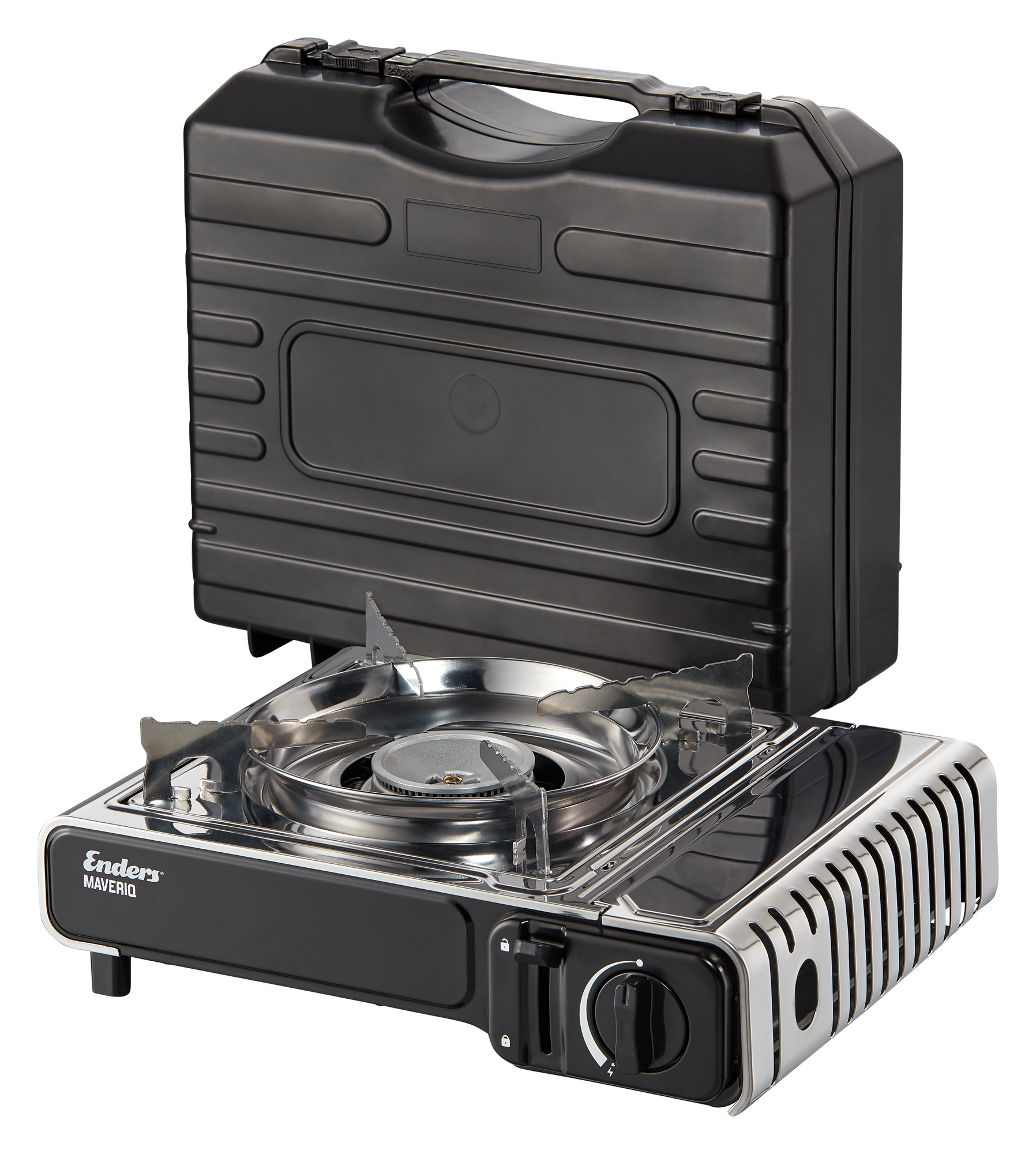 Enders Kartuschengaskocher Maveriq Mit dem Kartuschen-Gaskocher erlebst du extreme Leistung und enorme Sicherheit in einem mobilen Gerät. Durchdachte Sicherheitsfeatures wie eine Piezozündung, eine Überdruckabschaltung sowie ein Überhitzungsschutz bieten dir zudem ein gutes Kocherlebnis. Sicher im stoßfesten Kunststoffkoffer verpackt, wartet der Maveriq bereits auf dein nächstes Outdoor-Abenteuer. Details: * 2,2 kW leistungsstarker, stufenlos regulierbarer Brenner * Piezozündung * Maximaler Topf Ø 26cm * Oberfläche aus Edelstahl (Topfrost und Gehäuse) * Inkl. Tragekoffer aus stoßfestem Kunststoff * Koffermaß (BxTxH): 35 x 32 x 13 cm * Brenndauer pro Kartusche bei Volllast: 85 Minuten * Aufbaumaß (BxTxH): 34 x 28 x 12 cm * Gewicht: 1,6kg Hinweis: Das Gerät ist nicht für den Einsatz in geschlossenen Räumen geeignet. Art Kocher: Kartuschenkocher, Maße (BxHxT): 34 x 12 x 28 cm, Anzahl-Brennstellen: 1 Flamme, Ausführung: ohne Zündsicherung, Farbe: Schwarz, Gasdruck: Kein Gasdruck, Gewicht: 1,6 kg, Leistung: 2,2 kW, Zündsicherung: Nein