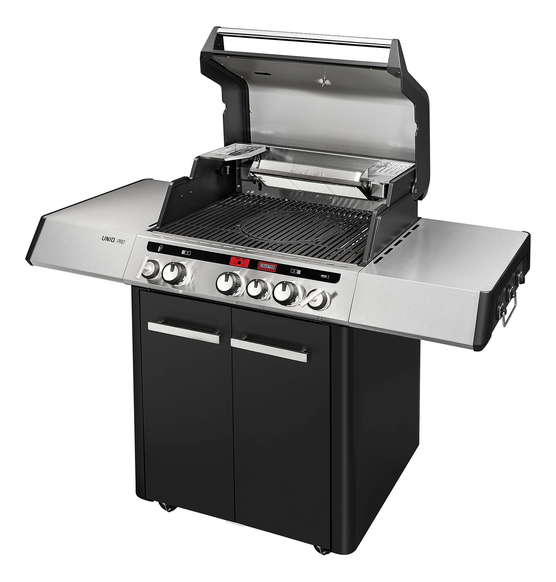 * Der innovative 800° C – heiße CRUSTER liefert erstmalig Oberhitze im Gasgrill und sorgt per excellence für das perfekte Steak, kross gebackene Pizza oder Crème Brûlée 800° TURBO ZONE mit Infrarot-Mesh * SWITCH GRID: Emaillierter Gussrost für vielfältige Grillmöglichkeiten * SIMPLE CLEAN: Einfache Reinigung durch werkzeuglos entnehmbare * Edelstahl-Einzelteile der Brennkammer * riesige Grillfläche mit ca. 3400 cm² bietet viel Platz zum Grillen * 3 Edelstahlbrenner für kraftvolles direktes und indirektes Grillen/Backen * 11-kg-Gasflasche kann im Unterschrank während des Betriebes verstaut werden Piezo Zündung: Ja, Material: Edelstahl/ Unterschrank: Stahl pulverbeschichtet, Grillmodell: Außenküche, Grillrost (LxB): 48 x 70 cm, Ausführung: PRO 3, Betriebsdruck: 50 mbar, Farbe: schwarz, Gewicht: 74 kg, Kochstellen: 4 Kochstellen, Leistung (W): 4,6 kW