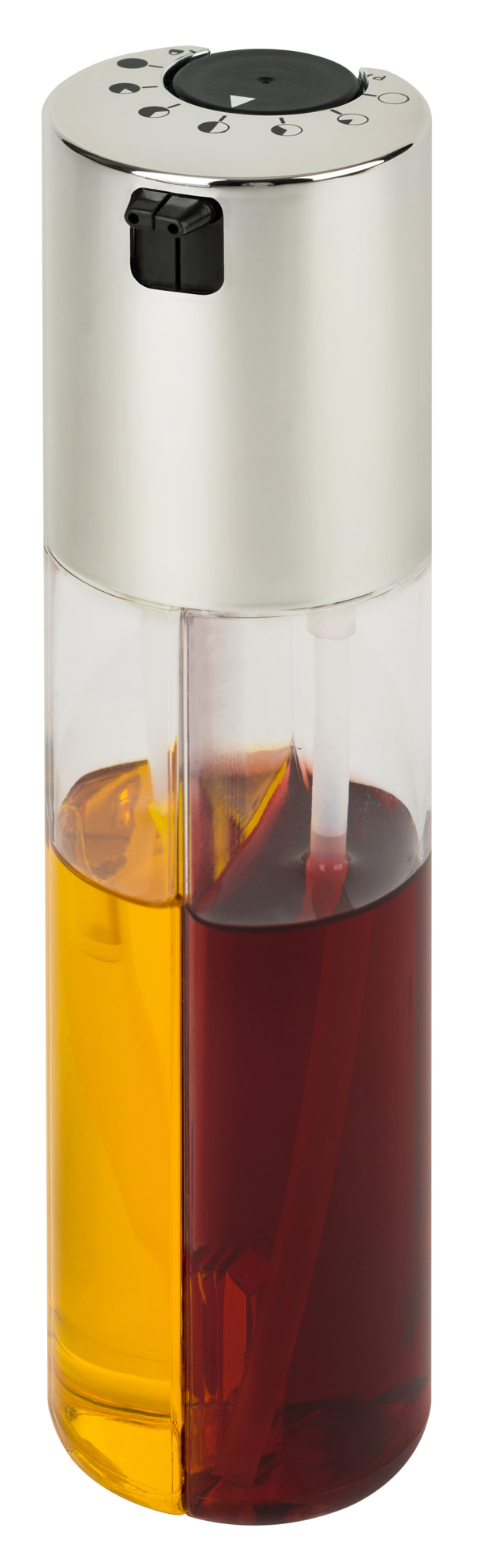 Essig-/Ölspender Duetto Mix mit einstellbarem Mischungsverhältnis Dieser Spender ist das perfekte Produkt für ein genaues, sauberes Dosieren, ob zu Hause oder auf Reisen. Er verfügt über 2 getrennte Tanks (Vol.: je Tank 100 ml), welche Sie mit Essig und Öl befüllen können. Die Dosierung erfolgt über ein verstellbares Rädchen am Spenderkopf. Sie können zwischen 7 verschiedenen Stufen wählen. Material: Polyethylenterephthalat, lebensmittelecht Material: Kunststoff, lebensmittelecht, Farbe: Silber