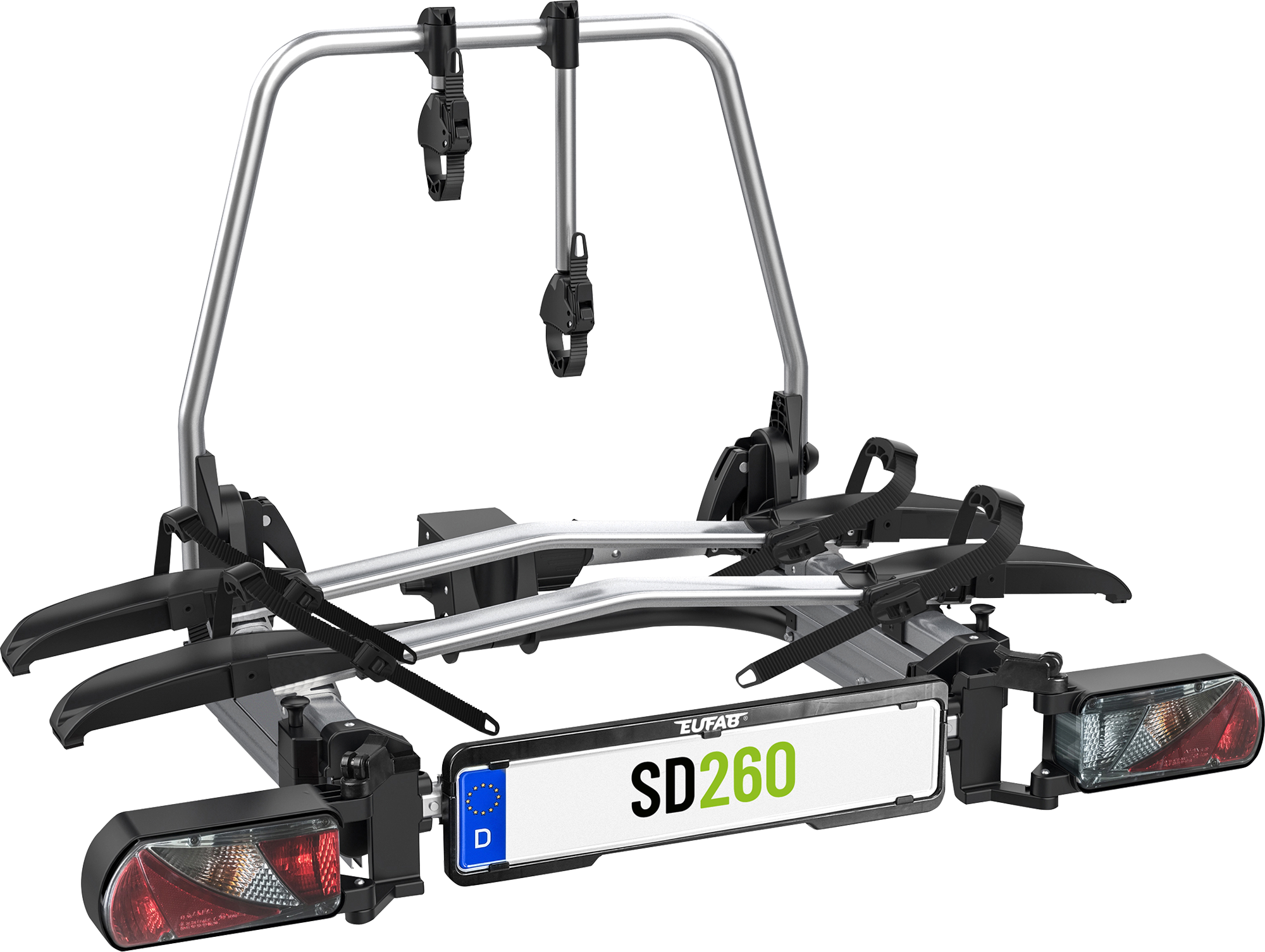 Der SD260 Flügeltür Fahrrad Kupplungsträger ist ein vormontierter Träger für bis zu zwei Fahrräder, auch geeignet für E-Bikes mit einer maximalen Nutzlast von 60 kg. Er verfügt über abnehmbare, abschließbare Rahmenhalter und ist für PKWs, Kastenwagen, Wohnmobile sowie Busse und Hochdachkombis geeignet. Mit einem Schiebeweg von 70 cm und stabilen Aluminiumschienen eignet sich der Träger für Fahrräder mit einer maximalen Reifenbreite von 3,25 Zoll. Details * Geeignet für 2 Fahrräder, auch E-Bikes * Abnehmbare und abschließbare Strap-Rahmenhalter mit Ratschen * Schnelle Montage mit Schnellverschluss-System * Ausziehbar um 70 cm für Türöffnungen bis 85 cm * Kompakte Staumaße und verstellbarer Kennzeichenhalter * Auch für Fahrräder mit Oversize und Y-Rahmen geeignet * Beleuchtungsanschluss mit 13-poligem Stecker * Fahrrad am Träger abschließbar * Träger abschließbar am Fahrzeug Technische Daten * Maximale Nutzlast: 60 kg * Gewicht: 20,5 kg * Radstand: Max. 130 cm * Max. Reifenbreite: 3,25 Zoll / 80 mm * Abmessungen (BxHxT, zusammengeklappt): 84 x 28 x 81 cm * Abmessungen (BxHxT, ausgeklappt): 130 x 77 x 81 cm * Schienenabstand: 24 cm * Material: Aluminium, Stahl, Kunststoff * Anschluss: 13-poliger Stecker * Kompatibilität: Passend für nahezu alle Anhängerkupplungstypen Lieferumfang * Fahrradträger SD260 Art Fahrradträger: Fahrradträger, Art Montage : Anhängerkupplung, Anzahl Fahrräder: 2 Fahrräder, Tragkraft max: 60 kg, Farbe: silber, Maße offen (BxHxT): 108 x 75 x 60 cm, Material: Stahl, Aluminium