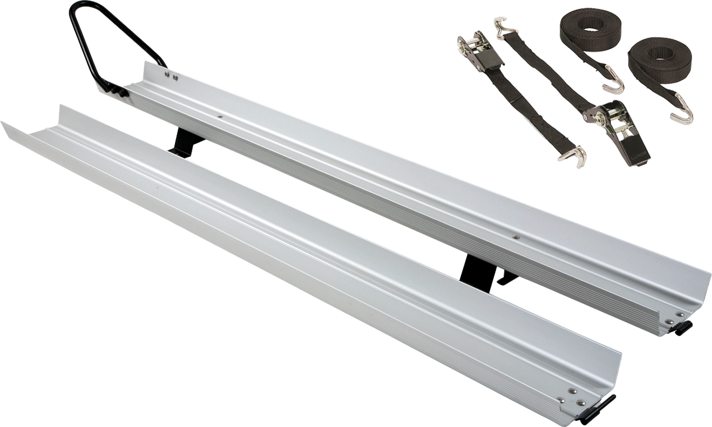 Auffahrschienen für Ihre Heckgarage! Für eine sicheres Be- und Entladen von Motorrollern, Motorrädern oder ähnlichem. Carry-Moto System bestehend aus einer stabilen Aluminiummotorradschiene und einer stabilen Auffahrschiene, die beim Beladen miteinander verbunden werden, um ein Wegrutschen zu verhindern. Mit einem beweglichen Haltebügel und 2 starken Riemen, um das Motorrad während der Fahrt sicher zu halten. Auffahrschienen auch zur Befestigung am Eingang zum Wohnbereich des Fahrzeuges geeignet. Zur Wahl des geeigneten Modelles bitte immer die nutzbare Höhe der Garage überprüfen. Details * Maximale Tragkraft 200 kg * Maximale Reifenbreite 14 cm * mit Befestigungsgurten Gewicht: 12,2 kg, Material: Aluminium, Maße (LxBxH): 180 x 7,5 x 6,5 cm