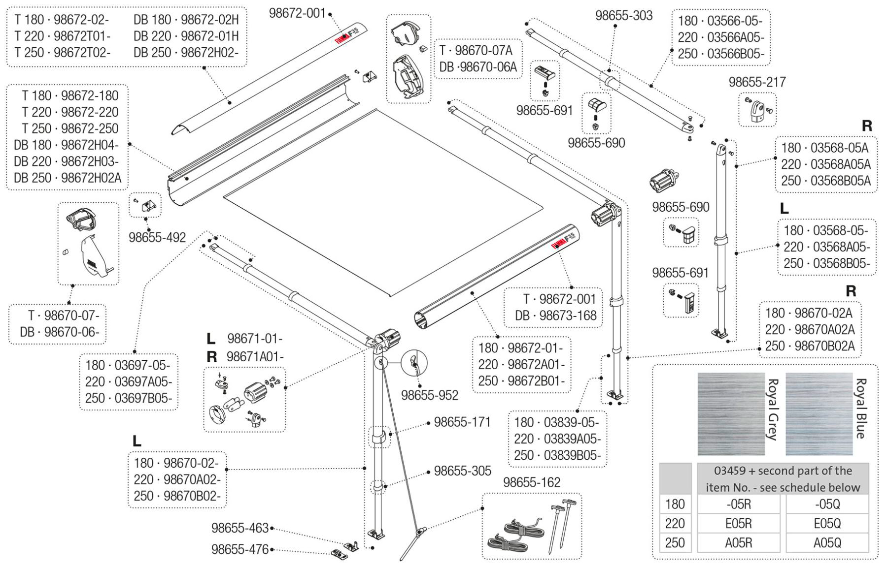 Fiamma Gehäuse für Markise: * F35pro 180 Deep Black Version 013/014 · S/N > 9357900 (F701991) · 06762—- · 06458—- Fiamma Ersatzteilnummer: 98672H04-