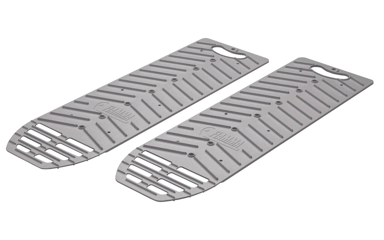 Geriffelte (anschraubbare) Unterlegplatten für Fiamma Level Up. Erhöht die Griffigkeit. Das Absinken auf weichem Untergrund, wie Sand oder Matsch, wird minimiert. 2er Set. Maße (LxB): 69 x 21 cm, Material: Polyvinylchlorid, Farbe: weiß