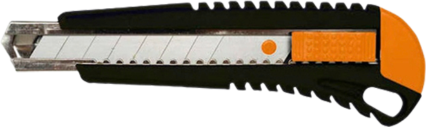 Automatisches Klingenblockiersystem. Stromlinienförmiger Kunststoffrumpf für sicheren Griffkomfort. Lieferumfang: Cuttermesser