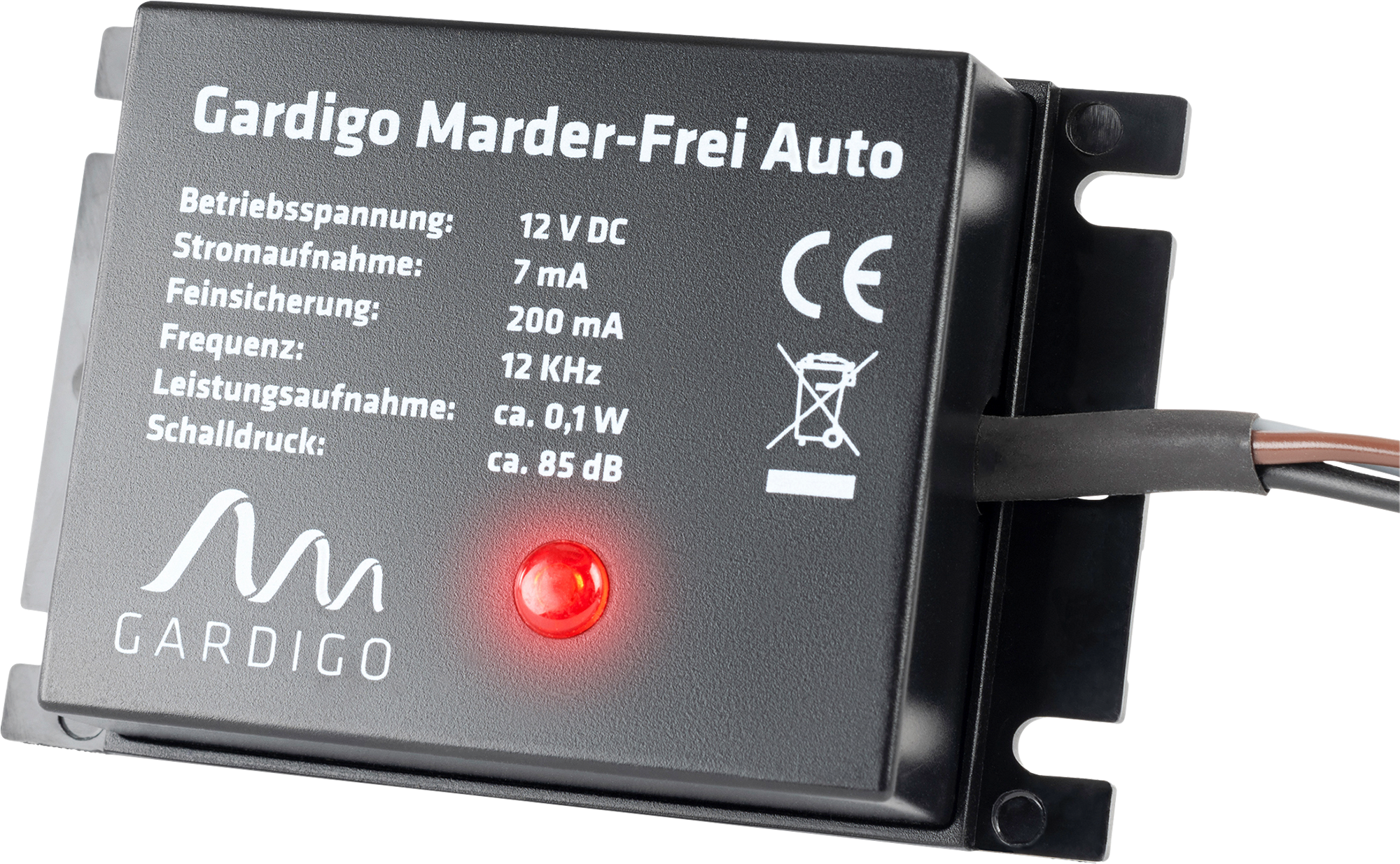 Marder-Frei Auto – Schutz vor Marderschäden im Motorraum Mit dem Marder-Frei Auto von Gardigo schützt du dein Fahrzeug zuverlässig vor Marderverbiss an Kabeln und Schläuchen. Das Gerät wird direkt an die 12-Volt-Batterie angeschlossen und sendet in 15-Sekunden-Intervallen hochfrequente Pfeiftöne (ca. 12 kHz) aus – für Menschen kaum hörbar, für Marder jedoch äußerst störend. Dank LED-Betriebsanzeige und geringem Stromverbrauch ist das Gerät ideal für den Dauerbetrieb geeignet und lässt sich leicht installieren. Perfekt für Benzin- und Dieselmotoren. Details * Schützt Kabel, Schläuche und andere Fahrzeugteile vor Marderverbiss * Hochfrequente Pfeiftöne: 15 Sekunden an / 15 Sekunden aus * Frequenz ca. 12 kHz, für Menschen kaum hörbar * Sehr geringer Stromverbrauch: ca. 0,1 Watt * Mit LED-Betriebsanzeige * Anschluss an 12 V Autobatterie * Ideal nach Motorwäsche zur Marderabwehr Technische Daten * Frequenz: 12 Kilohertz (± 10 %) * Frequenzintervall: 15 s an / 15 s aus * Schalldruck: ca. 85 Dezibel * Anschlussleitung: ca. 50 cm * Feinsicherung: 200 Milliampere * Stromstärke: 7 Milliampere * Stromverbrauch: ca. 0,1 Watt * Spannung: 12 Volt Gleichstrom (DC) * Betriebsanzeige: LED * Produktmaße: 9 x 5,5 x 2,5 cm (Breite x Höhe x Tiefe) * Verpackungsmaße: 8 x 14,3 x 3,9 cm Lieferumfang * 1 x Marder-Frei Auto * 1 x Anschlussleitung mit Sicherung * 1 x mehrsprachige Bedienungsanleitung (DE, GB, FR, ES, IT, NL, CZ) Farbe: schwarz, Marderabwehr : Ultraschallabwehr