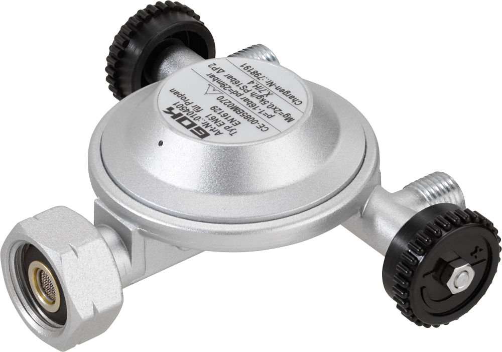 GOK Kombi Niederdruckregler Typ EN61 mit 2 Abgängen 1 kg/h 50 mbar – Camping-Gasdruckregler