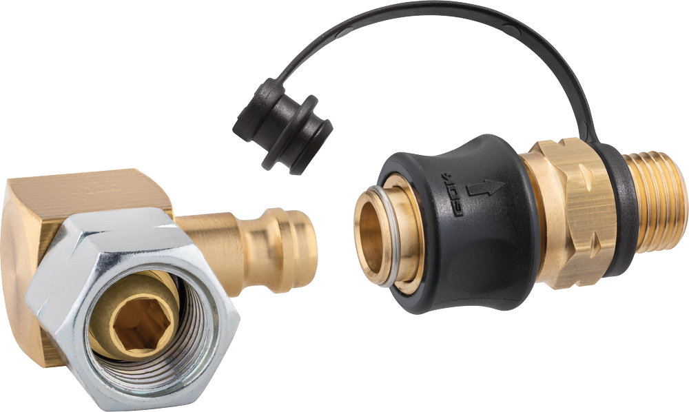 GOK Steckkupplung-Set Typ SKU-QR zum Verbinden von Schlauchleitungen mit mobilen Gasgeräten G 1/4 LH-KN auf SKU und STN x G 1/4 LH-ÜM 90° – Gasadapter und -kupplung